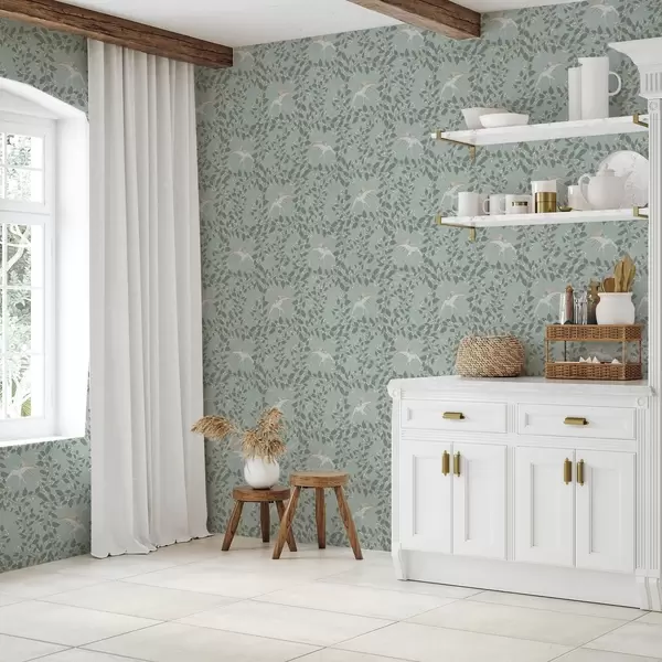 Tapetai Šakos su baltomis uogomis ir paukščiais ant žalios fono Nr. a00731