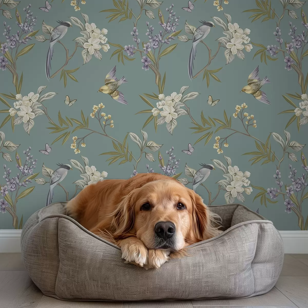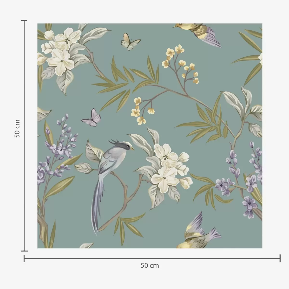 Tapetai Paukščiai, gėlės ir drugeliai ant mėlynai pilko fono Nr. a00735