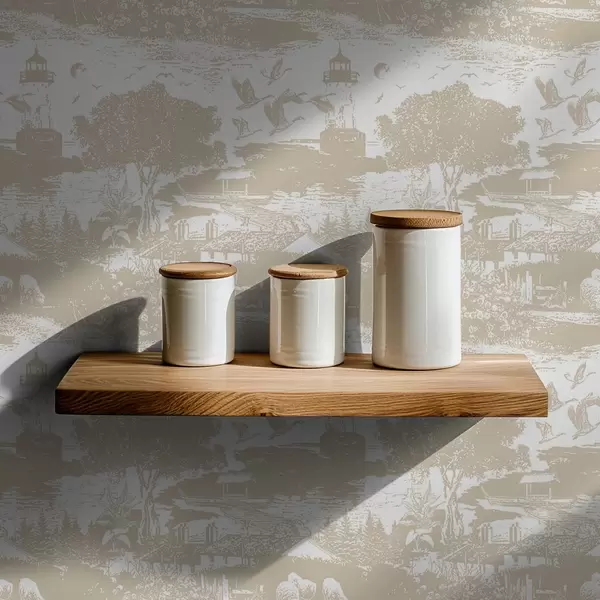 Tapetai Scena su švyturiu, medžiais ir namais sienos spalvos fone Nr. a00739