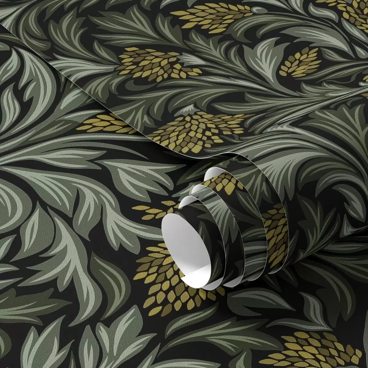Tapetai Tamsiai žali akanto lapai su auksiniais kankorėžiais ant juodo fono Nr. a00745