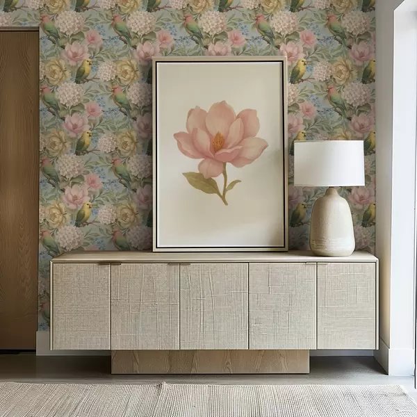 Tapetai Papūgos tarp bijūnų, hortenzijų ir magnolijų Nr. a00747