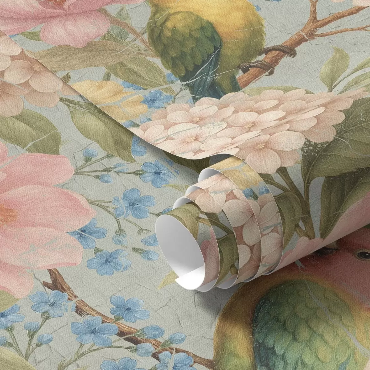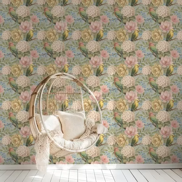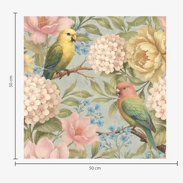 Tapetai Papūgos tarp bijūnų, hortenzijų ir magnolijų Nr. a00747