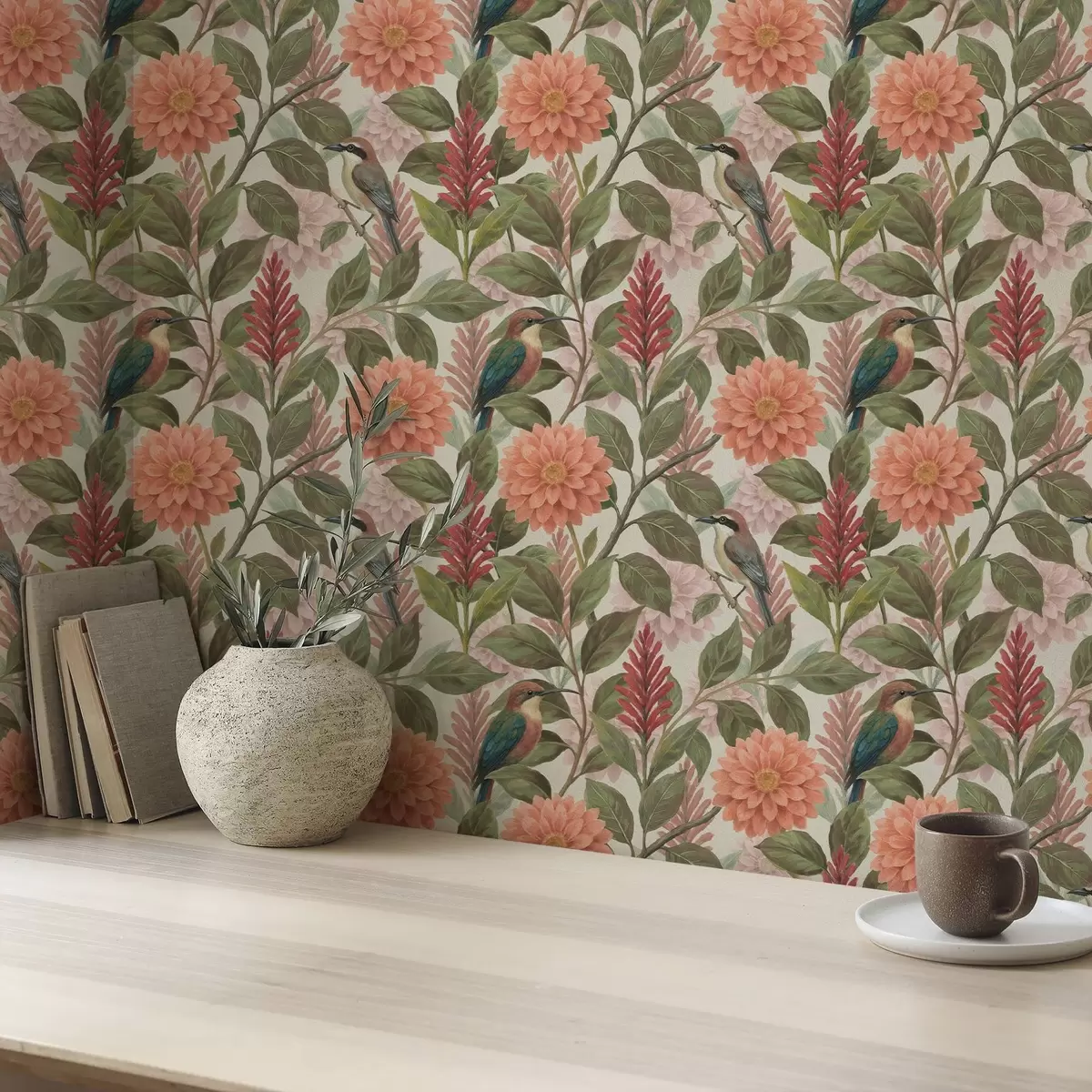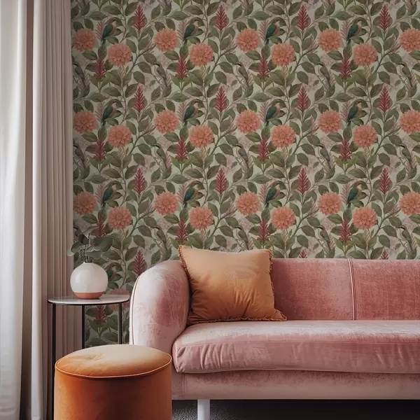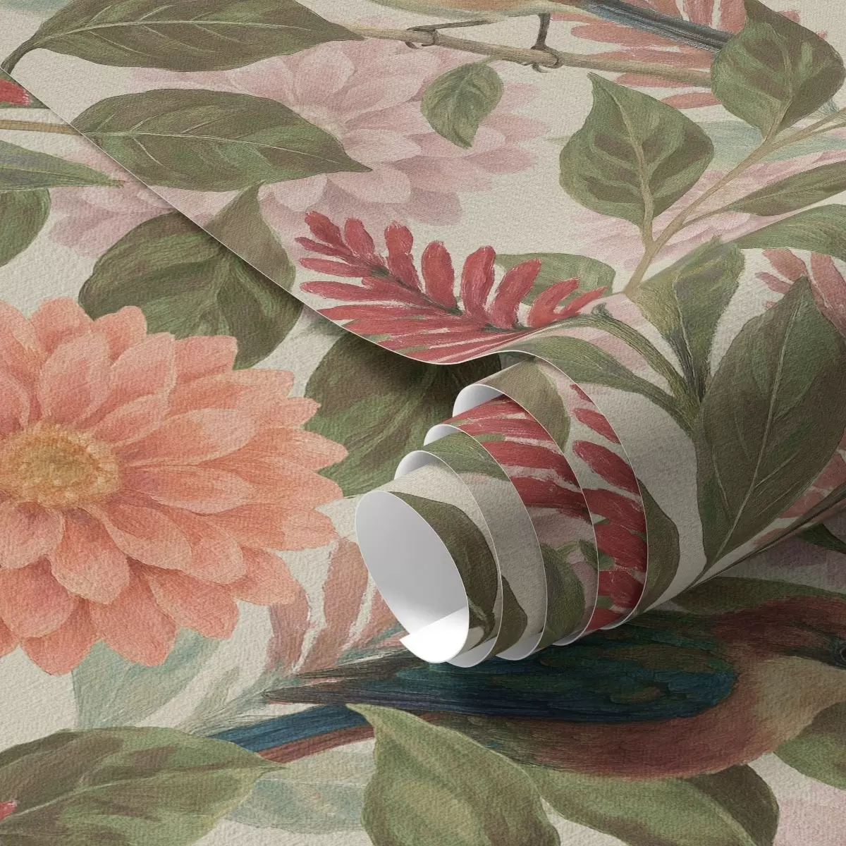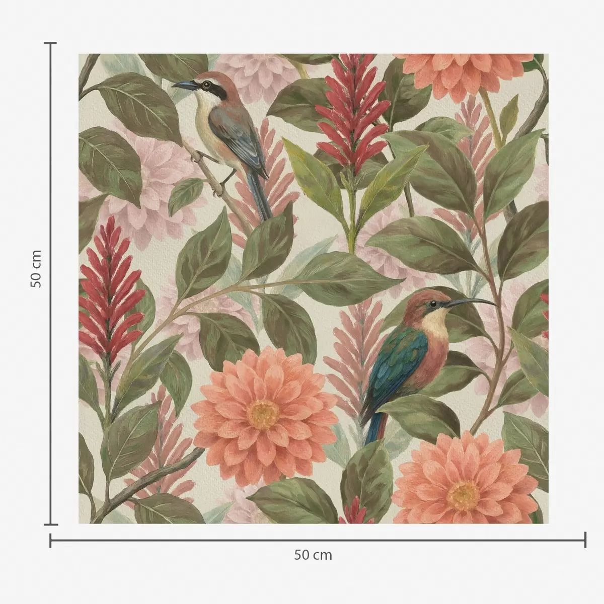Tapetai Paukščiai tarp gėlių ir lapų šiltų atspalvių Nr. a00753