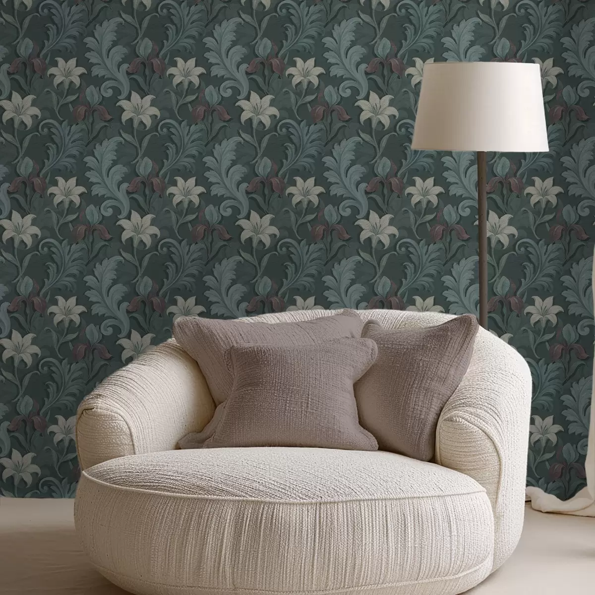 Tapetai Tamsiai žalias fonas su vilkdalgiais ir dekoratyviniais lapais Nr. a00755
