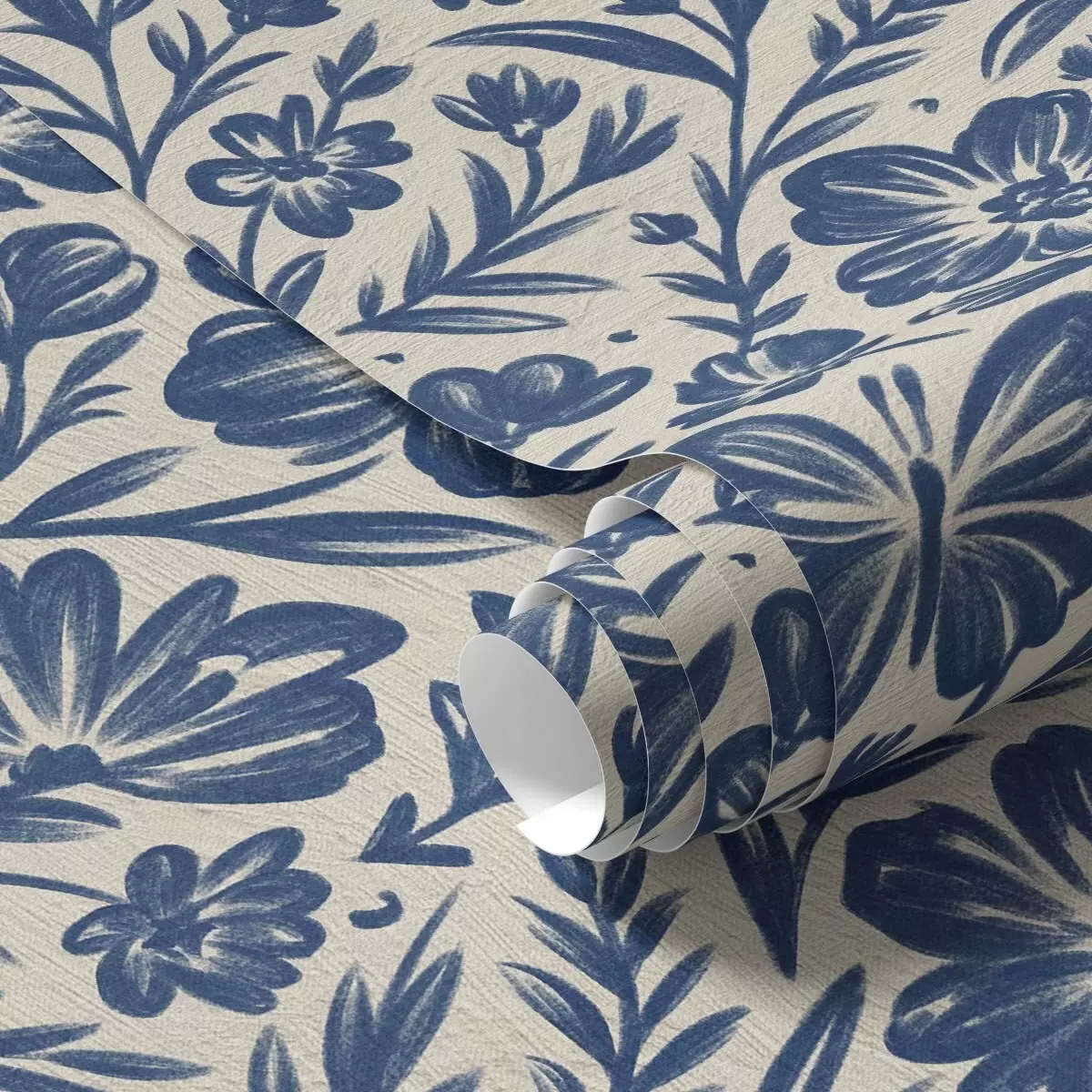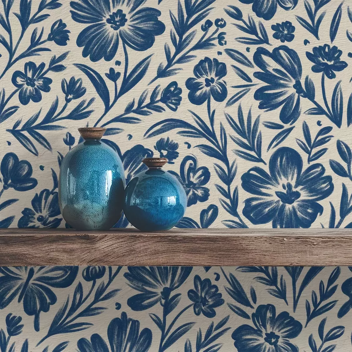 Tapetai Mėlynas gėlių ornamentas su drugeliais Nr. a00758