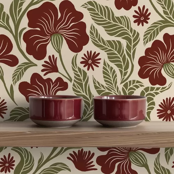 Tapetai Bordo spalvos gėlės su žaliais lapais ant šviesaus fono Nr. a00761