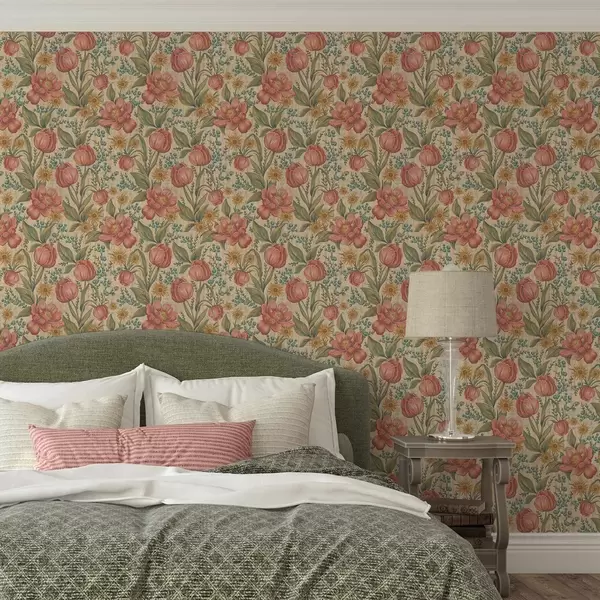 Tapetai Vintage tulipai ir astros, tekstūruotas kreminis fonas Nr. a00773