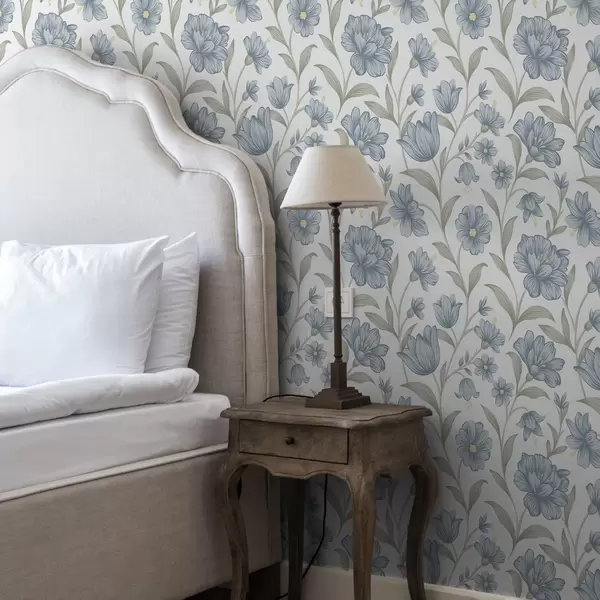 Tapetai Dulkėti mėlyni žiedai su alyvuogių lapais ant balto fono Nr. a00780