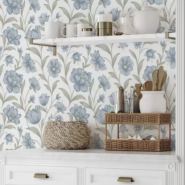 Tapetai Dulkėti mėlyni žiedai su alyvuogių lapais ant balto fono Nr. a00780