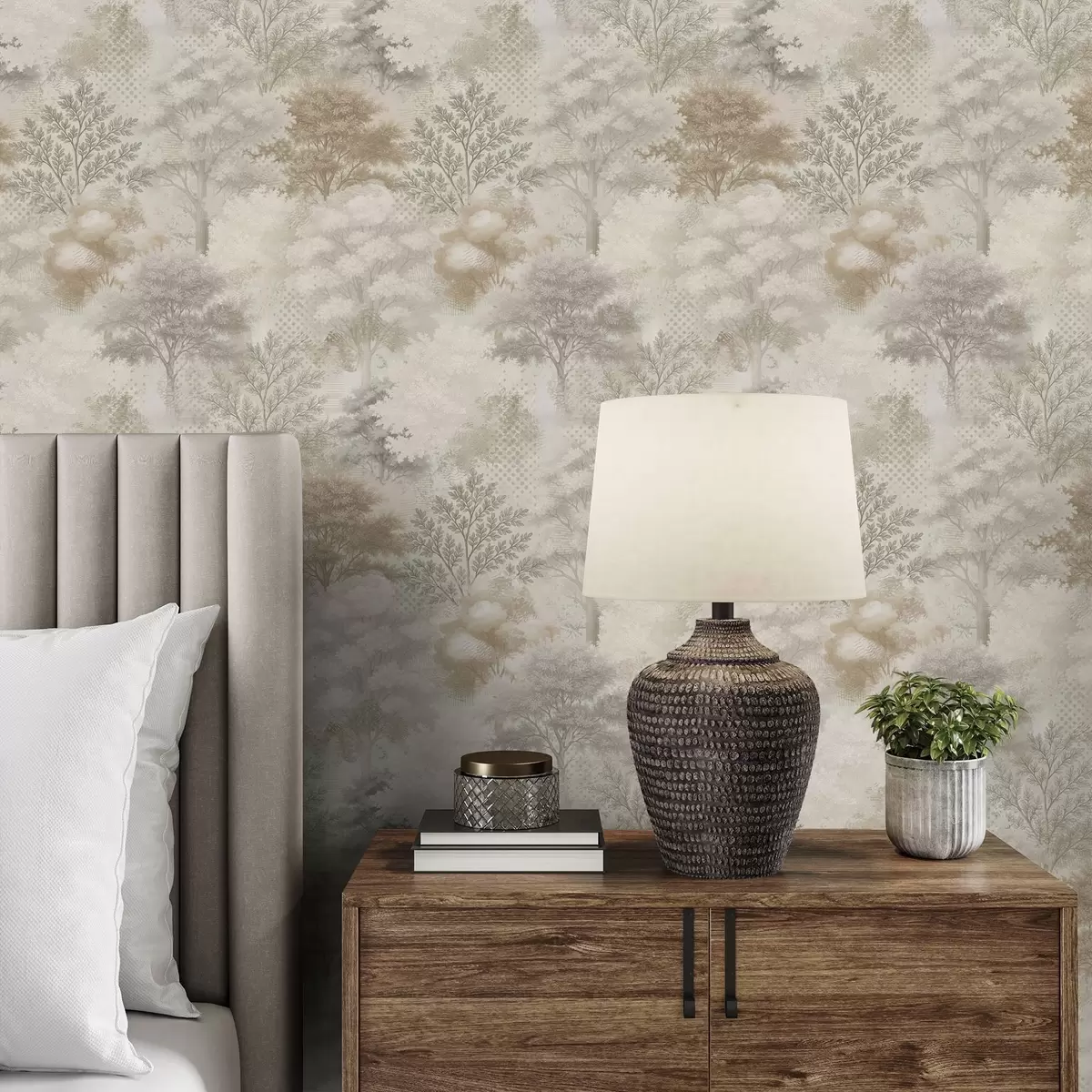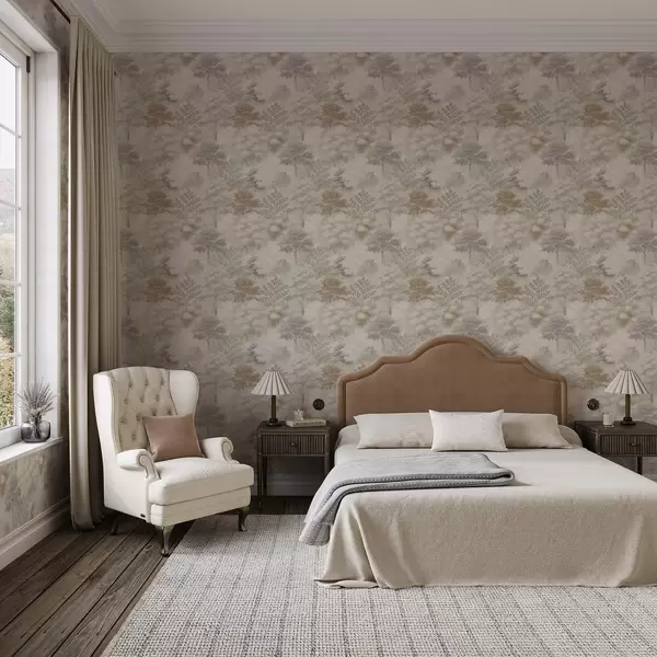 Tapetai Švelnus miškas rūke, švelnūs smėlio-pilkos spalvos atspalviai Nr. a00785