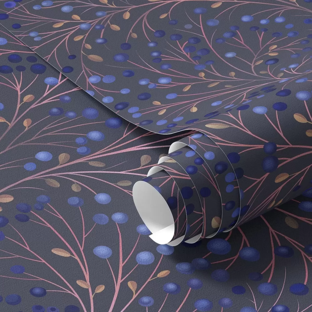 Tapetai Rožinės-rudos šakos ir mėlynos uogos ant grafito fono Nr. a00787
