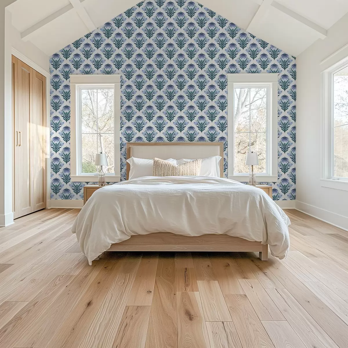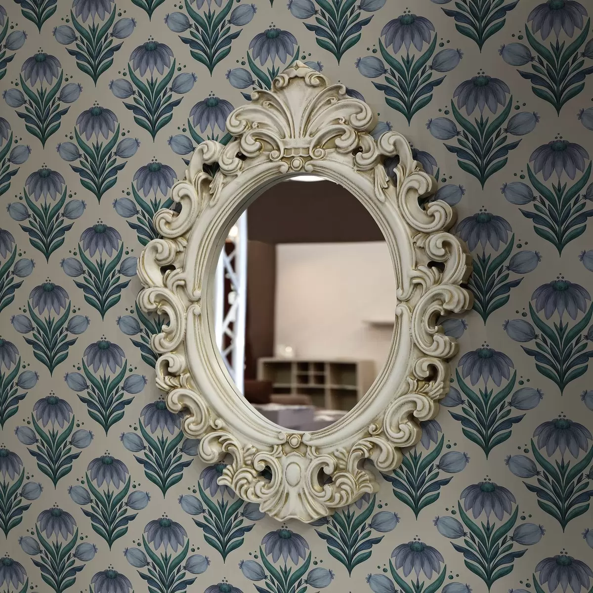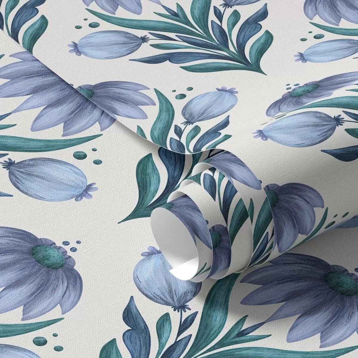 Tapetai Simetriškas gėlių ornamentas mėlynų ir baltų atspalvių Nr. a00812v2