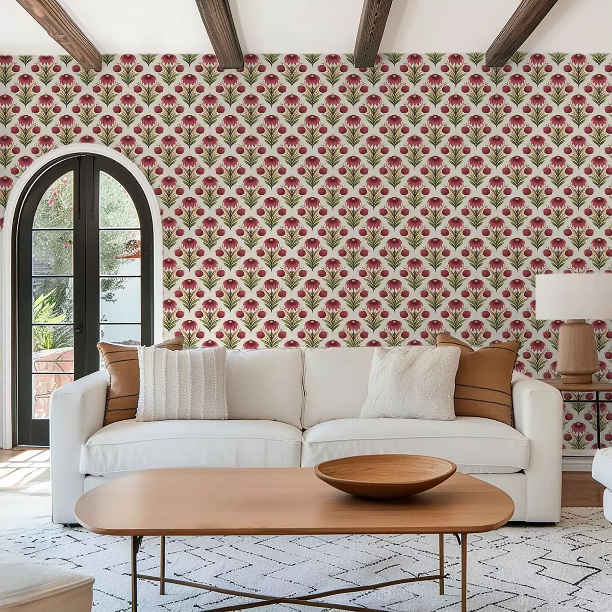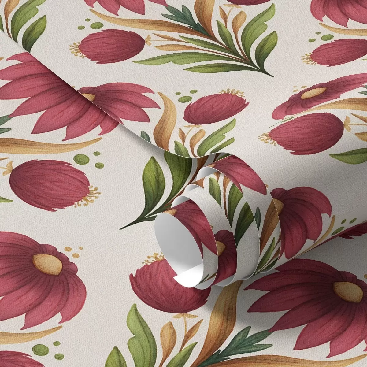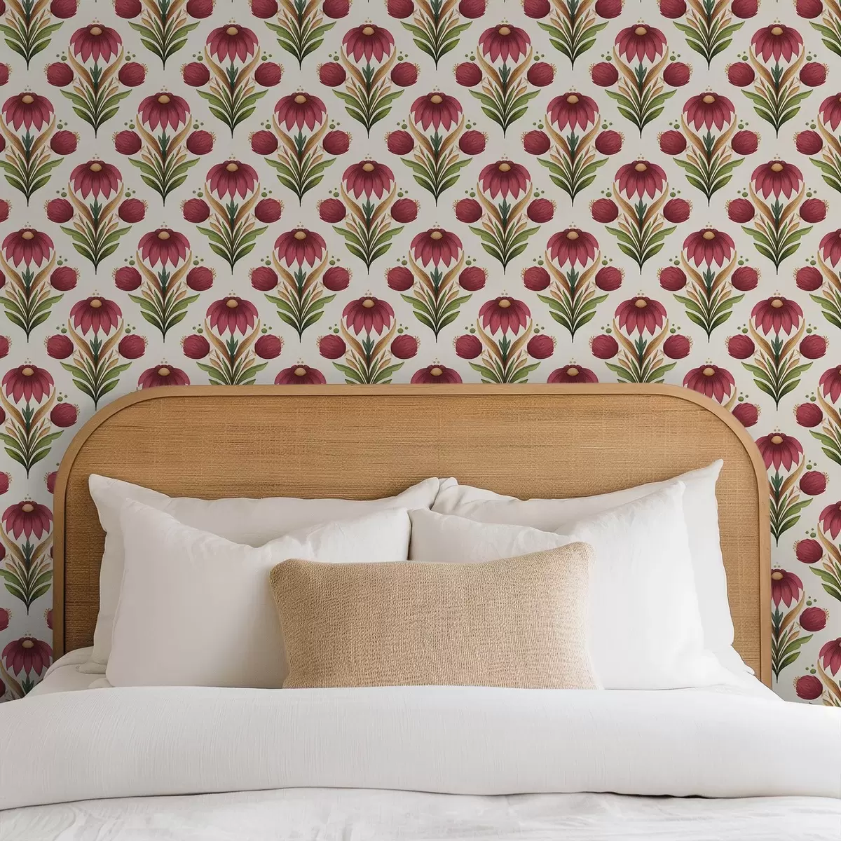 Tapetai Simetriškas gėlių ornamentas sodriomis raudonos ir žalios spalvų tonais Nr. a00812v4