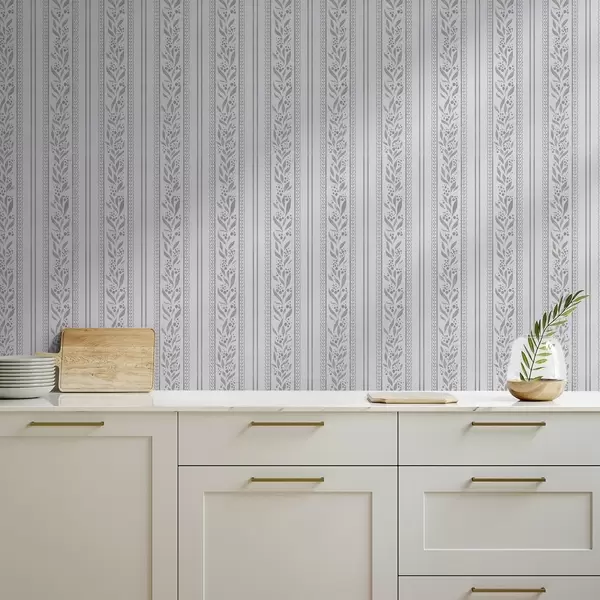 Tapetai Juostelės su nėriniais ir šakelėmis ant šalto balto fono Nr. a00814v1