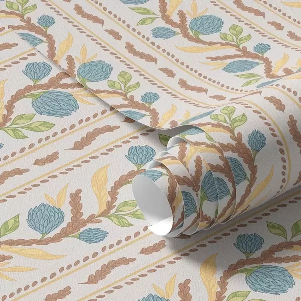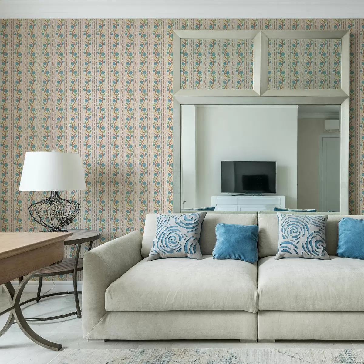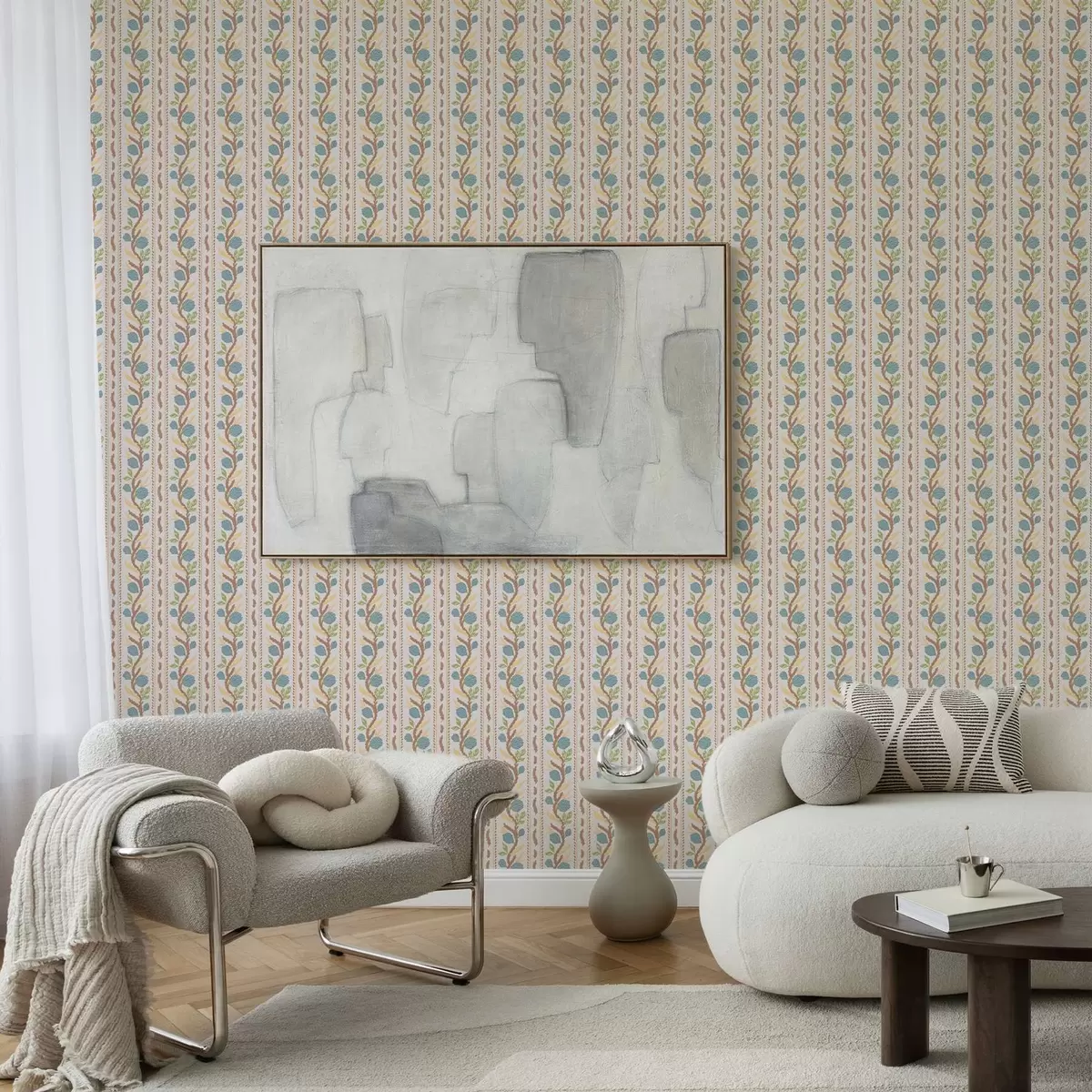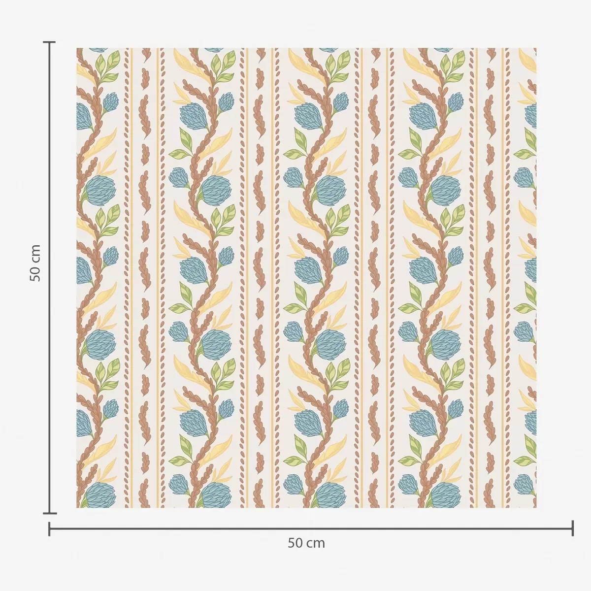 Tapetai Vertikalios puokštės juostos su mėlynomis gėlėmis ant šilto fono Nr. a00816v3