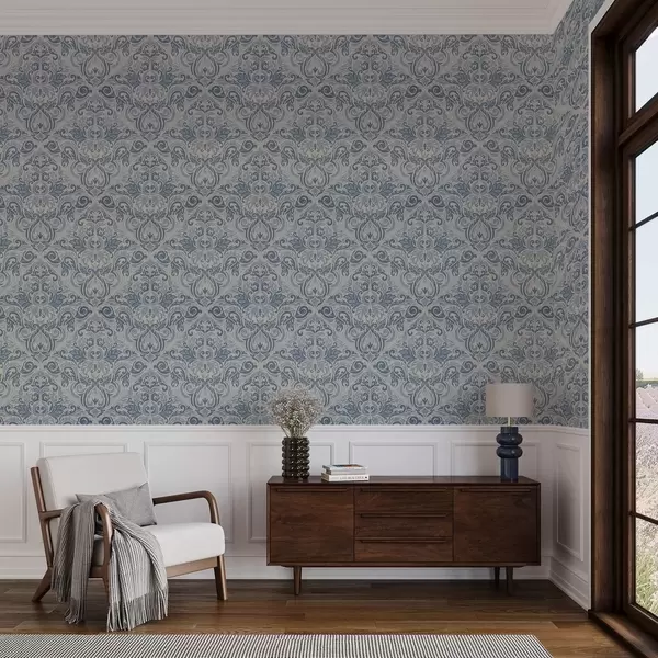 Tapetai Klasikinis damastas, mėlyni motyvai ant kreminės spalvos fono Nr. a00826v1