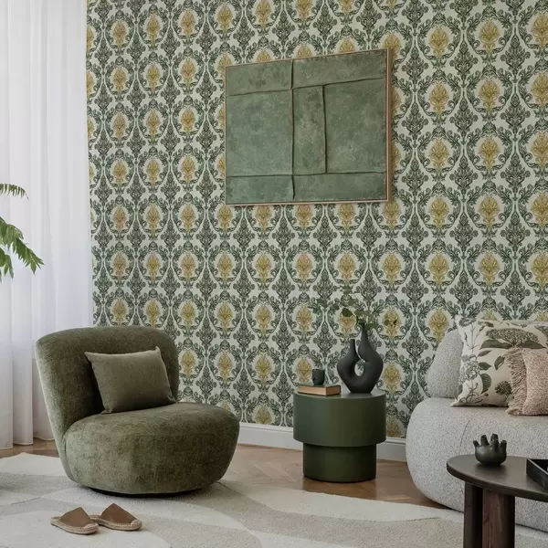 Tapetai Damaskas su žaliais raštais ant šviesaus fono Nr. a00828v1