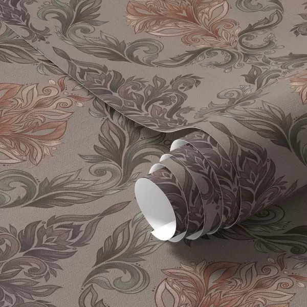 Tapetai Damaskas rudos-terakotos spalvų paletėje, šiltas pilkas fonas Nr. a00828v2