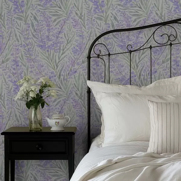 Tapetai Levandų šakos violetiniais atspalviais ant šviesaus fono Nr. a00835