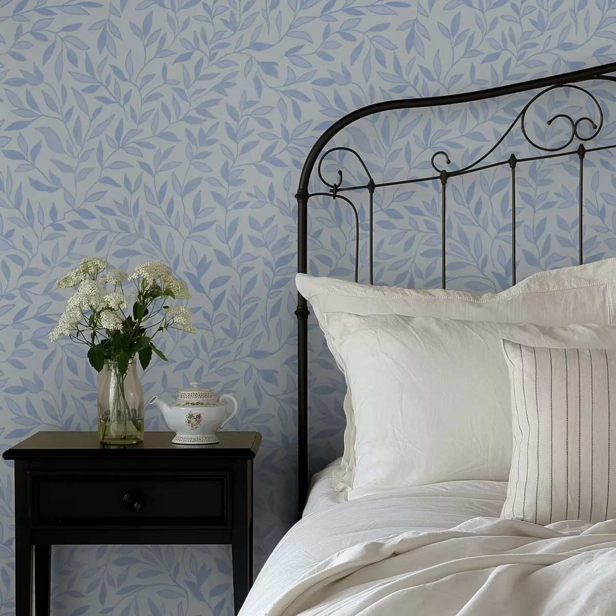 Tapetai Mėlynos šakelės su lapais ant šviesiai mėlynos spalvos Nr. a00842
