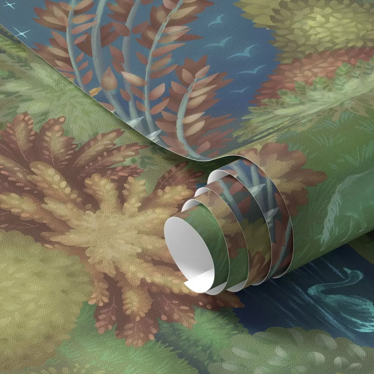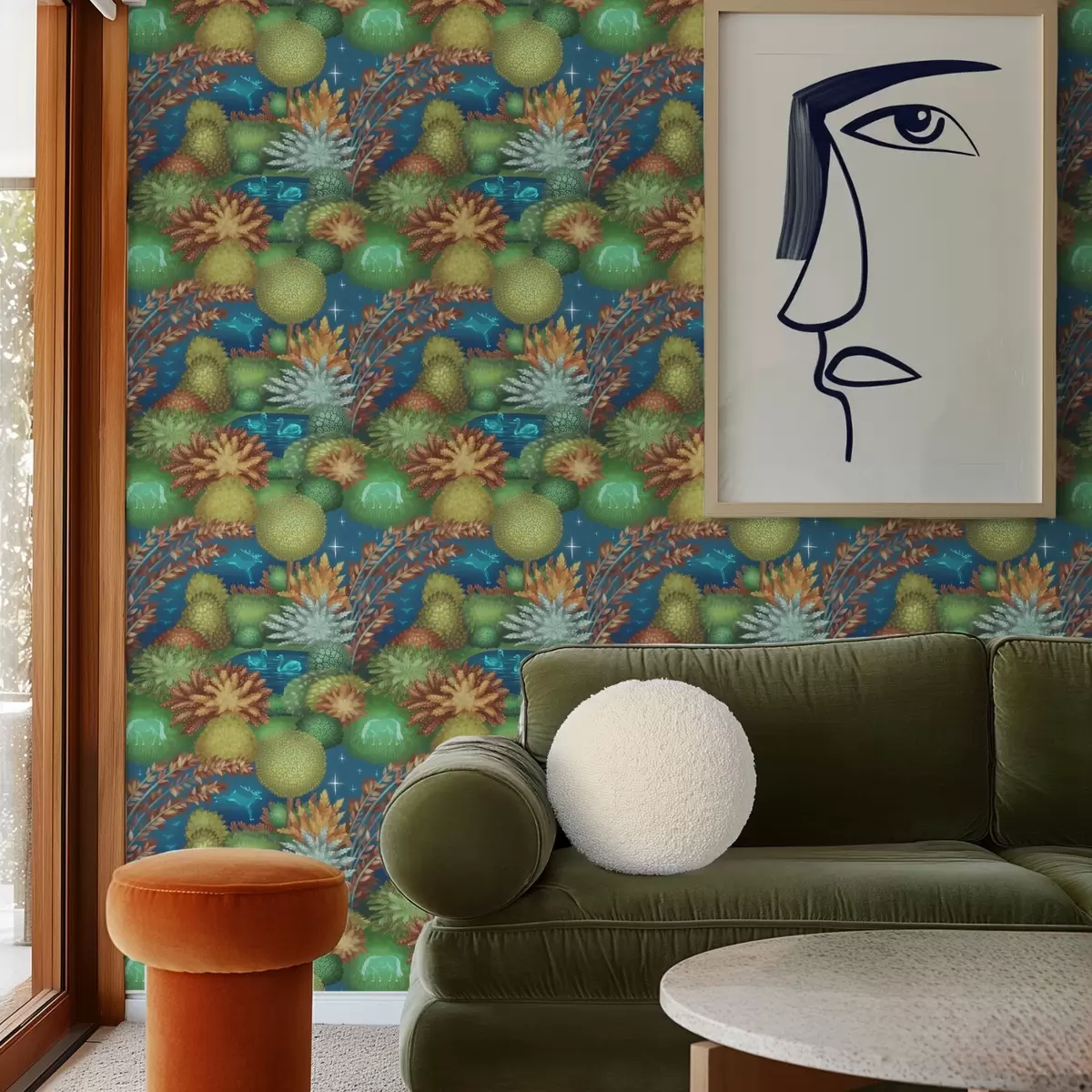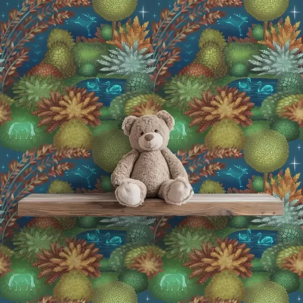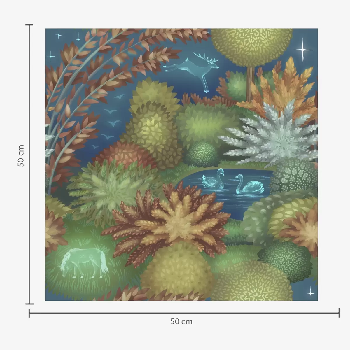 Tapetai Pasakų naktinis sodas su ežeru ir šviečiančiais gyvūnais Nr. a00851