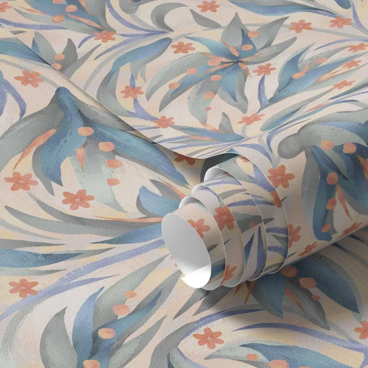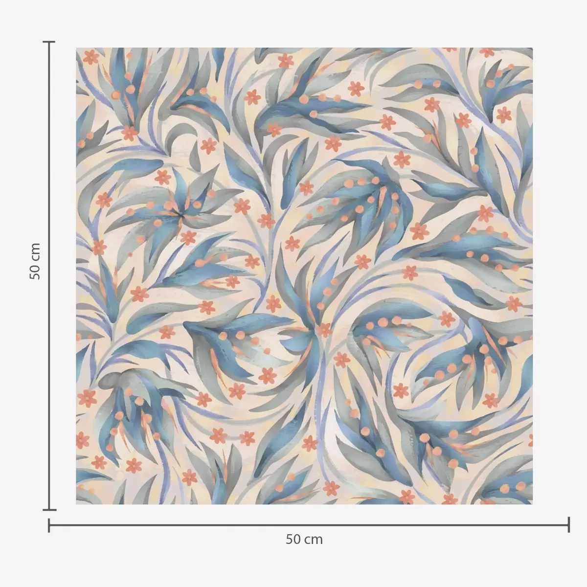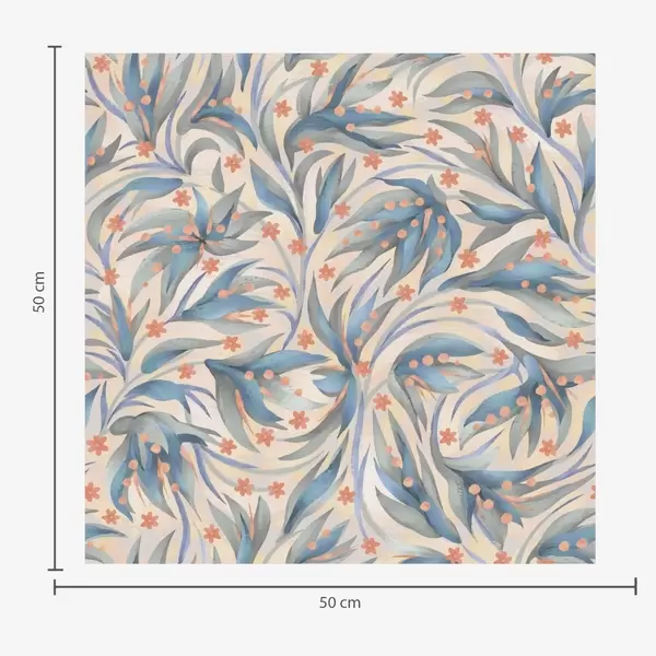 Tapetai Abstrakčios mėlynos spalvos lapai su koralų spalvos žiedais Nr. a00852