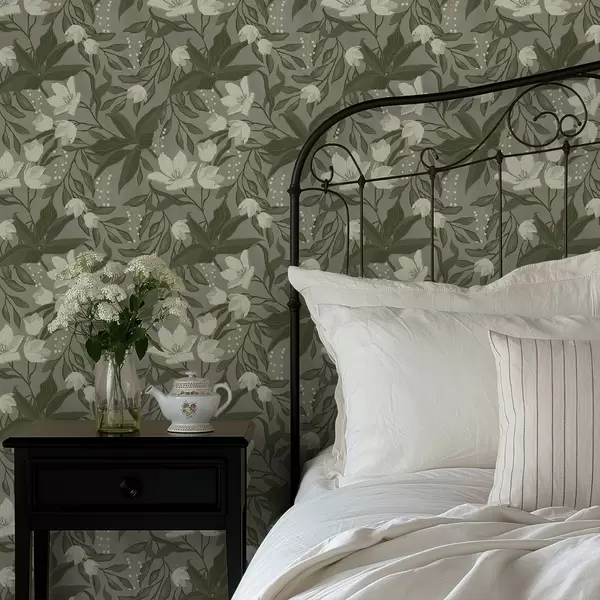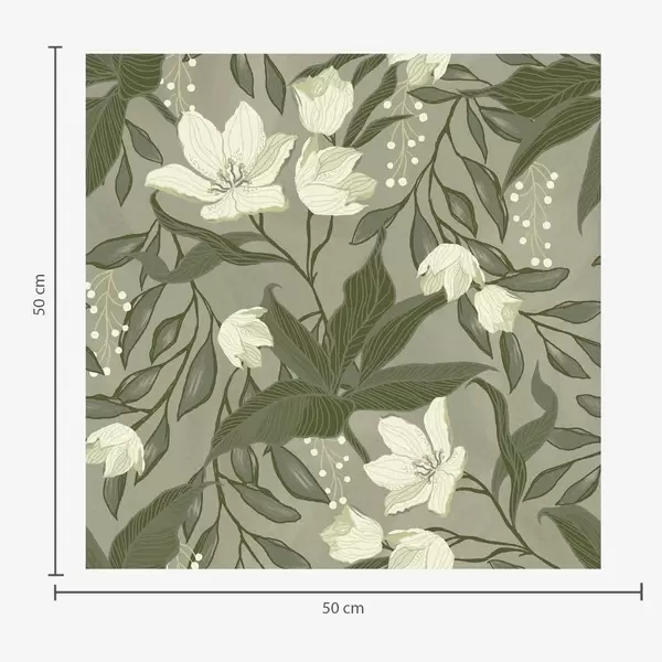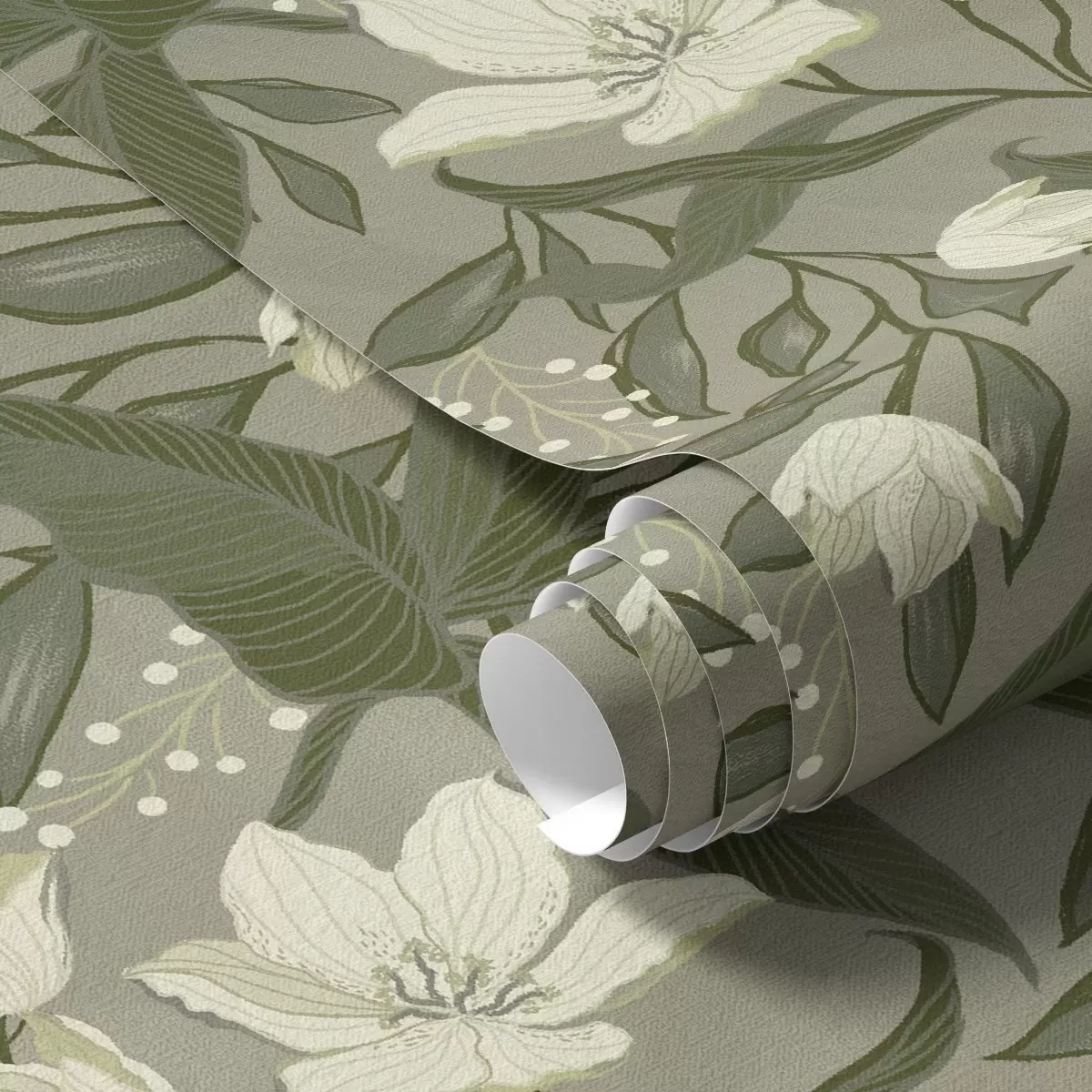 Tapetai Blyškios lelijos ir lapai ant pilkai alyvuogės spalvos fono Nr. a00854