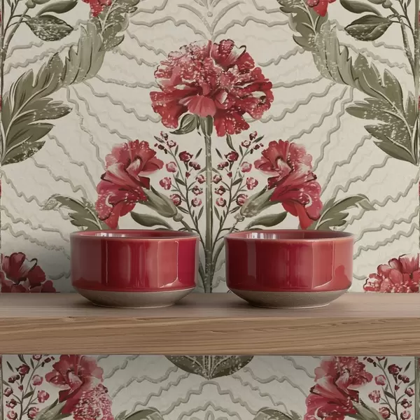 Tapetai Didelės raudonos bijūnės su grafinio fono, kreminės spalvos pagrindu Nr. a00857