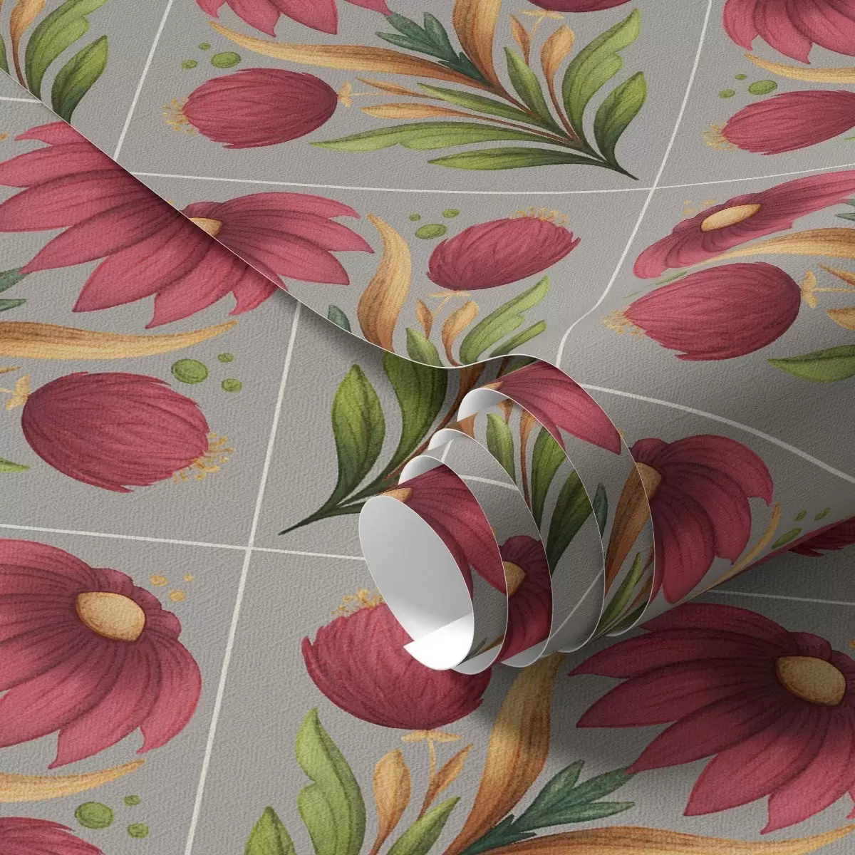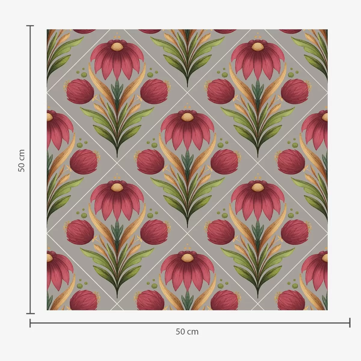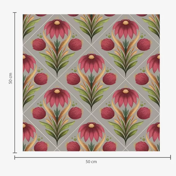 Tapetai Simetriškas gėlių ornamentas ant pilko fono su įstrižainėmis Nr. a00869
