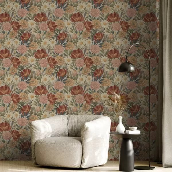 Tapetai Vintage sodas žydi šiltais terakotos ir persikų atspalviais Nr. a00874