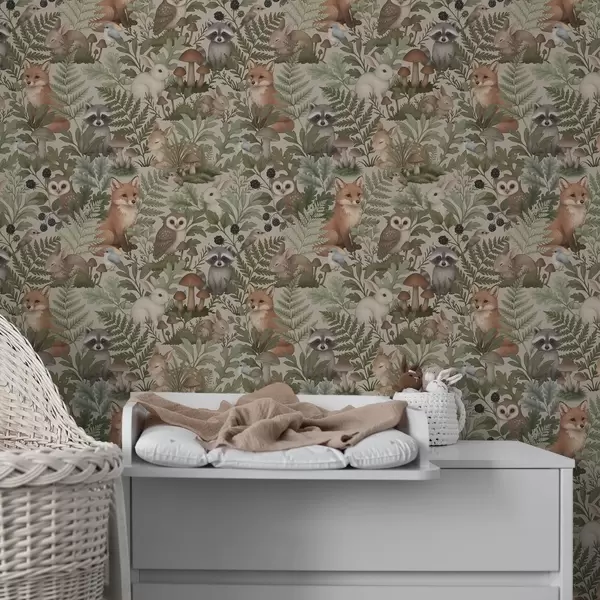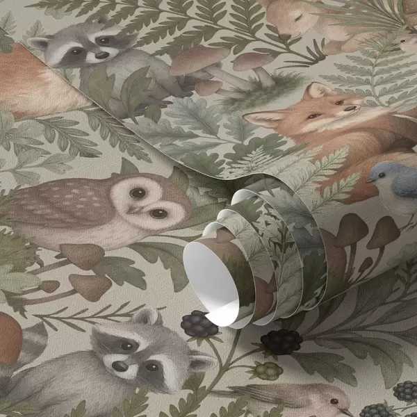 Tapetai Miško gyvūnai, paparčiai ir grybai ant šviesiai smėlio spalvos fono Nr. a00880v1