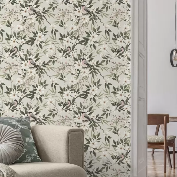 Tapetai Balta krūtinėmis snieginės zylės ant šakų su kreminėmis gėlėmis Nr. a00889