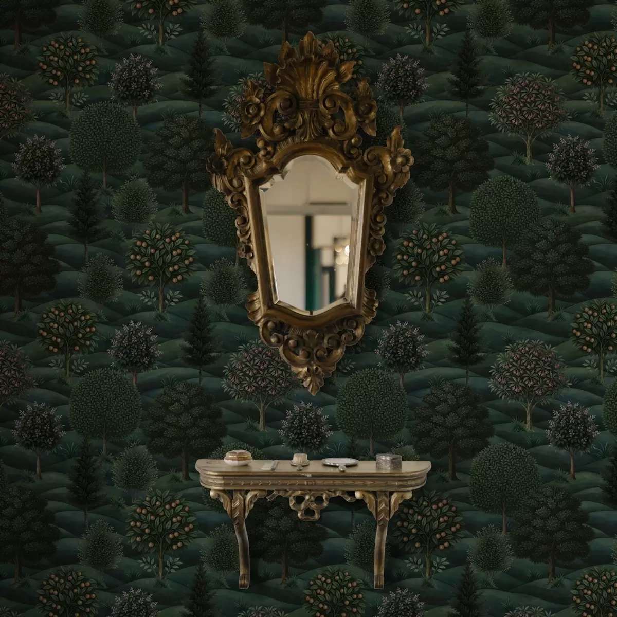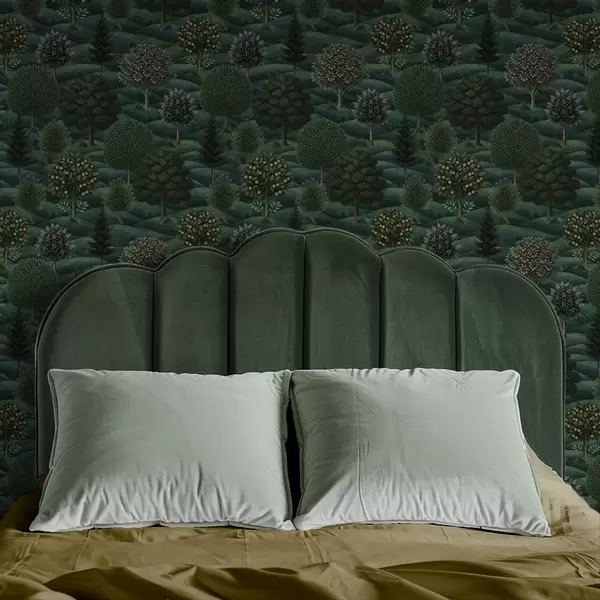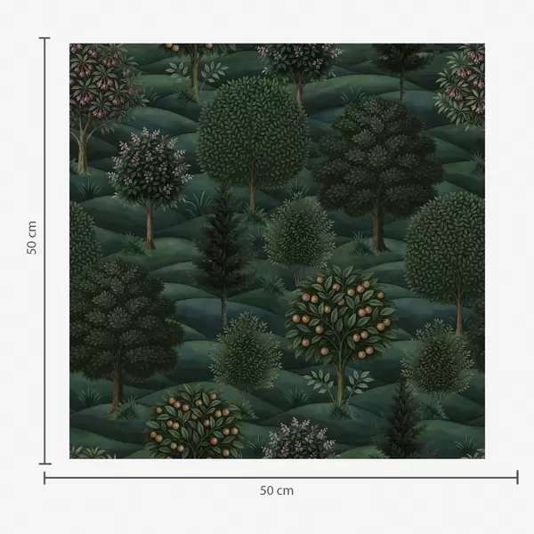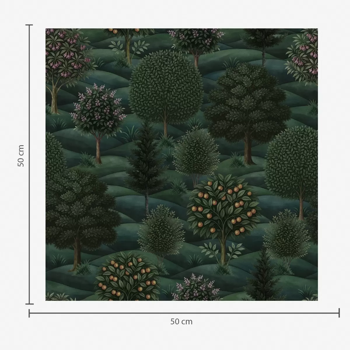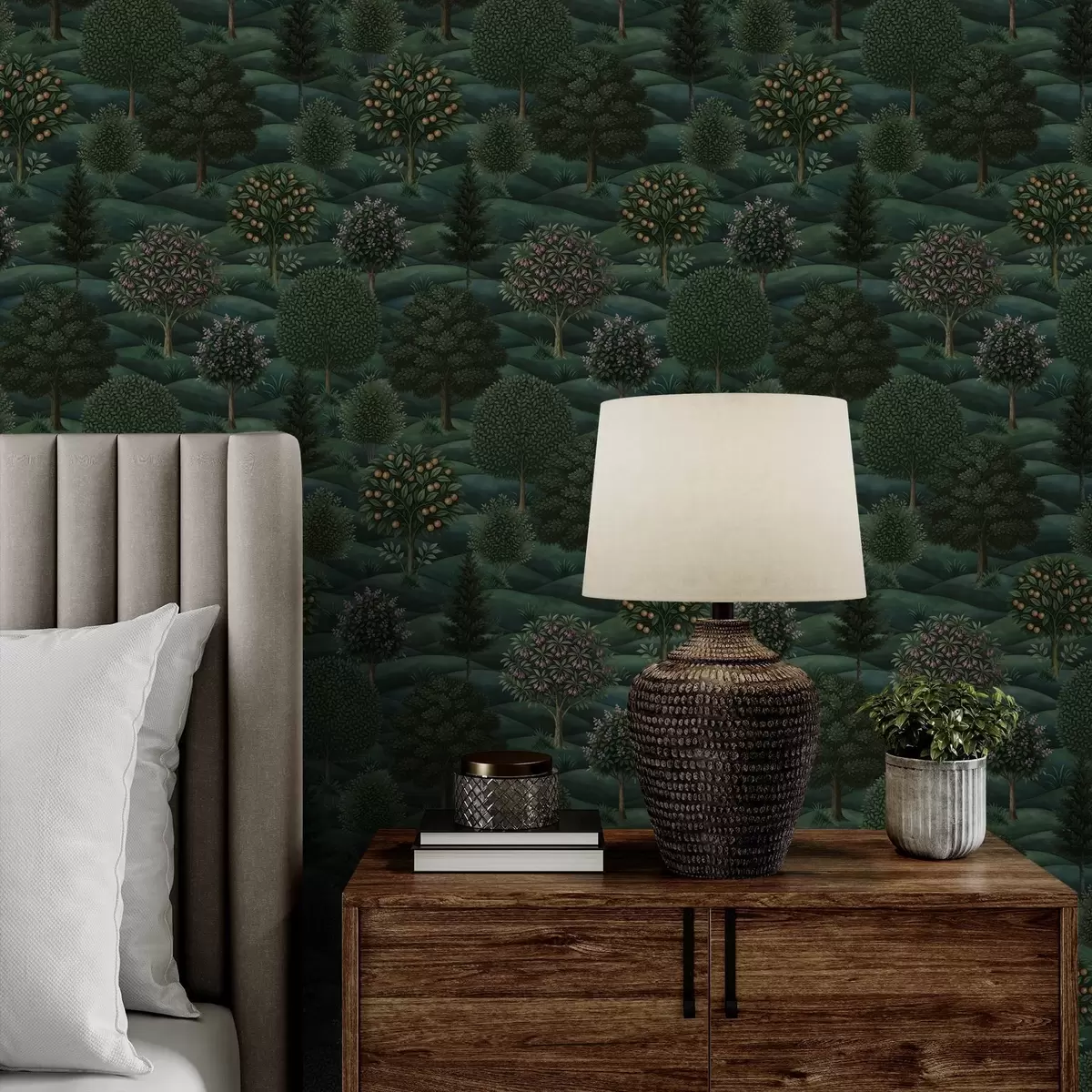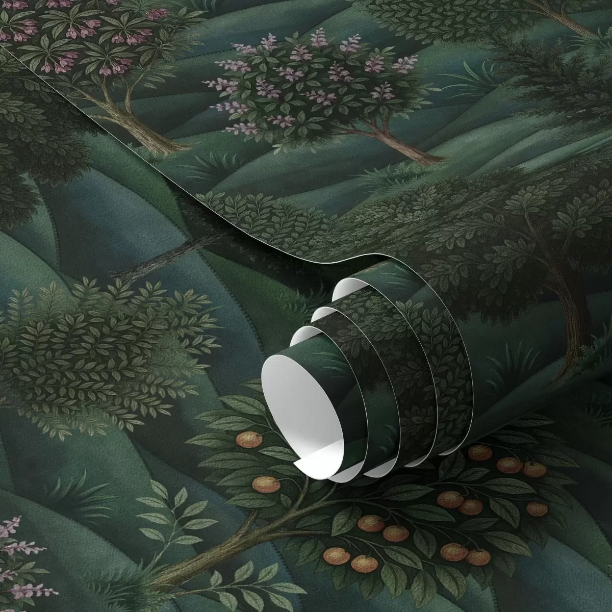 Tapetai Turtingas žalias kalvotas kraštovaizdis su raštuotais medžiais Nr. a00892