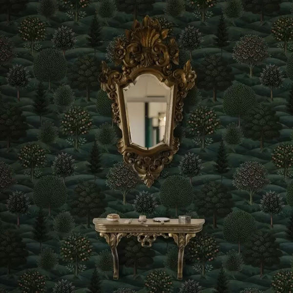 Tapetai Turtingas žalias kalvotas kraštovaizdis su raštuotais medžiais Nr. a00892