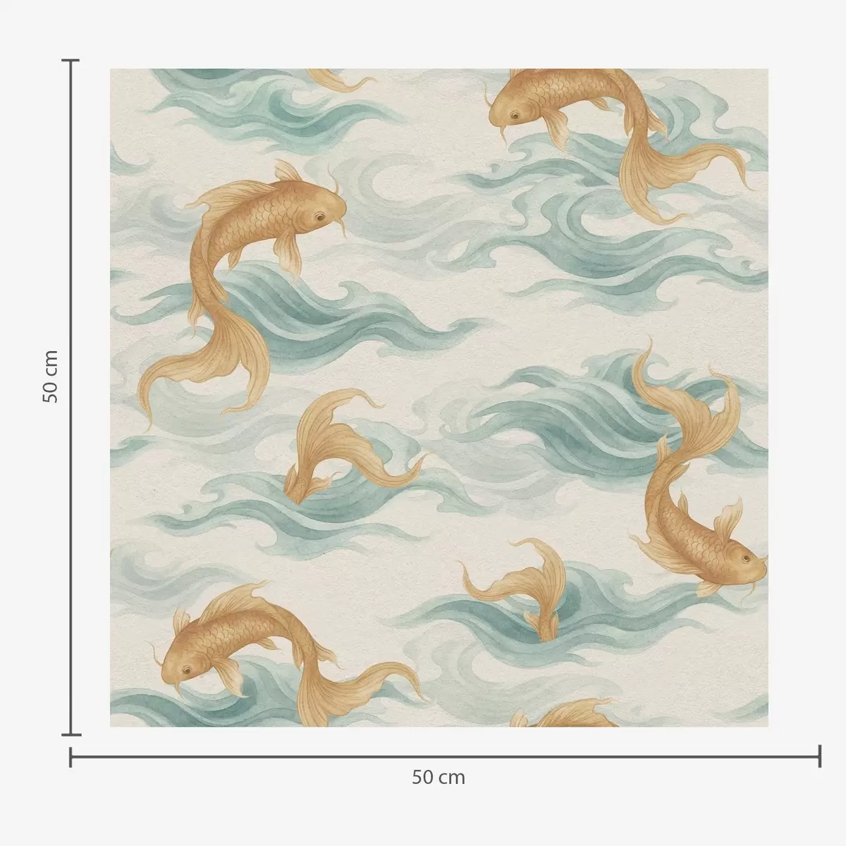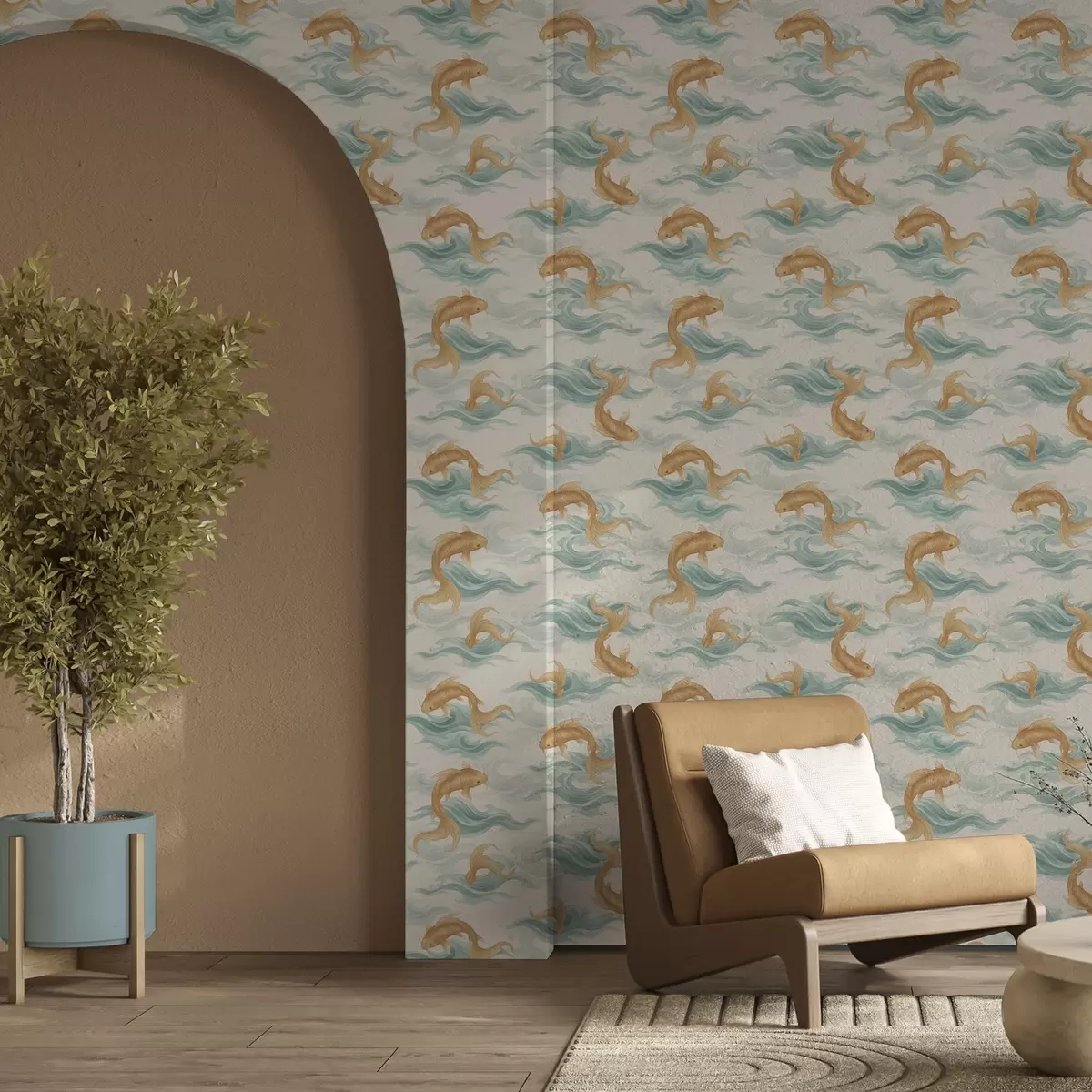 Tapetai Gintarinės koi žuvys, plaukiojančios tarp švelnių turkio spalvos bangų Nr. a00894