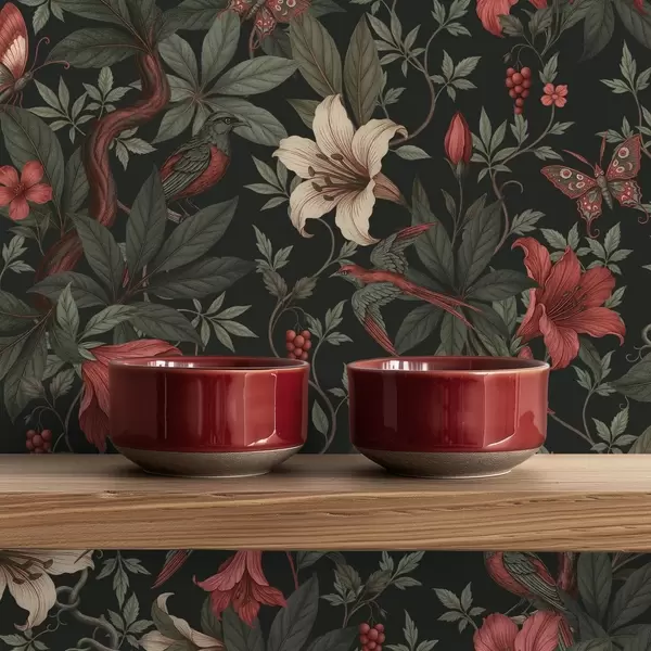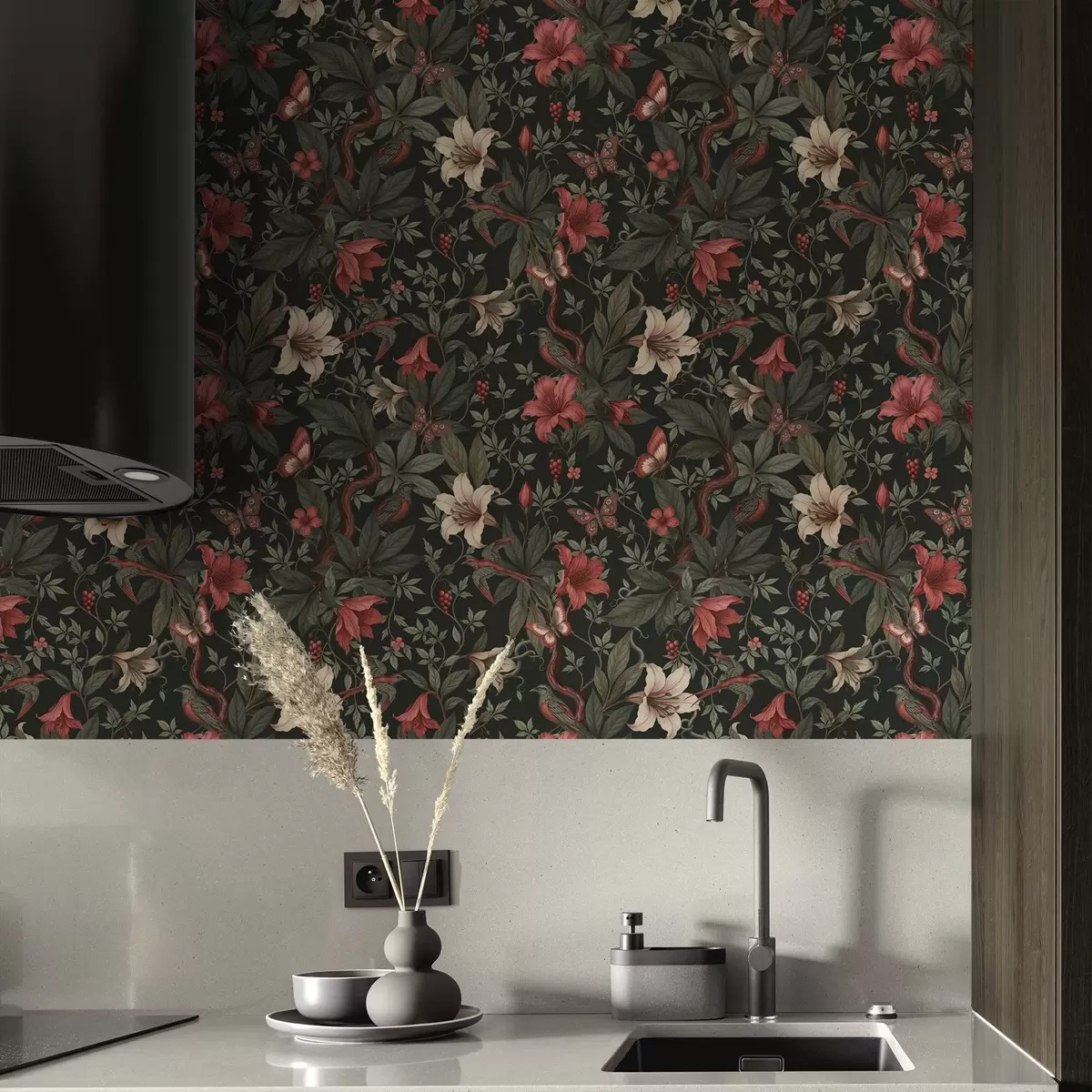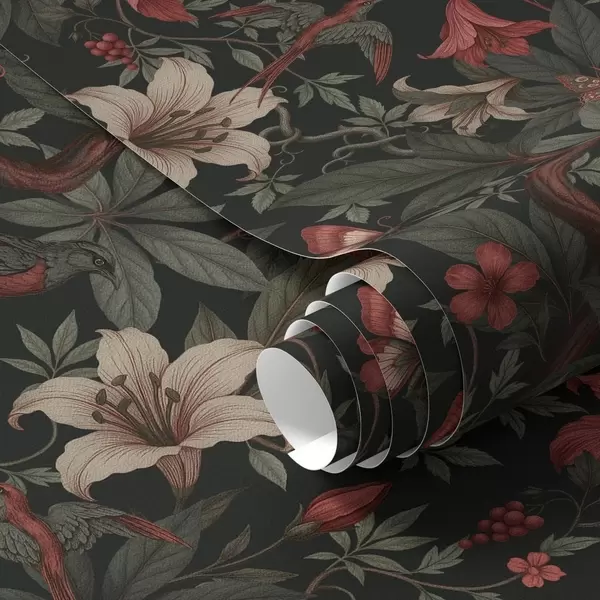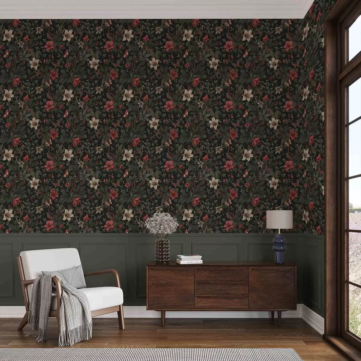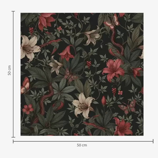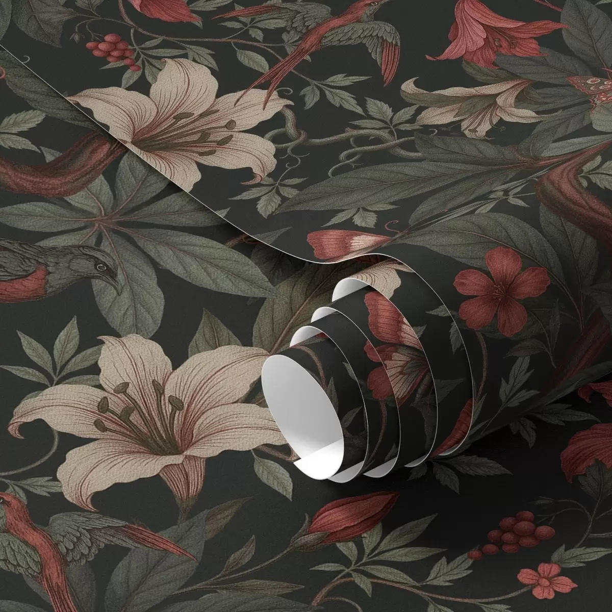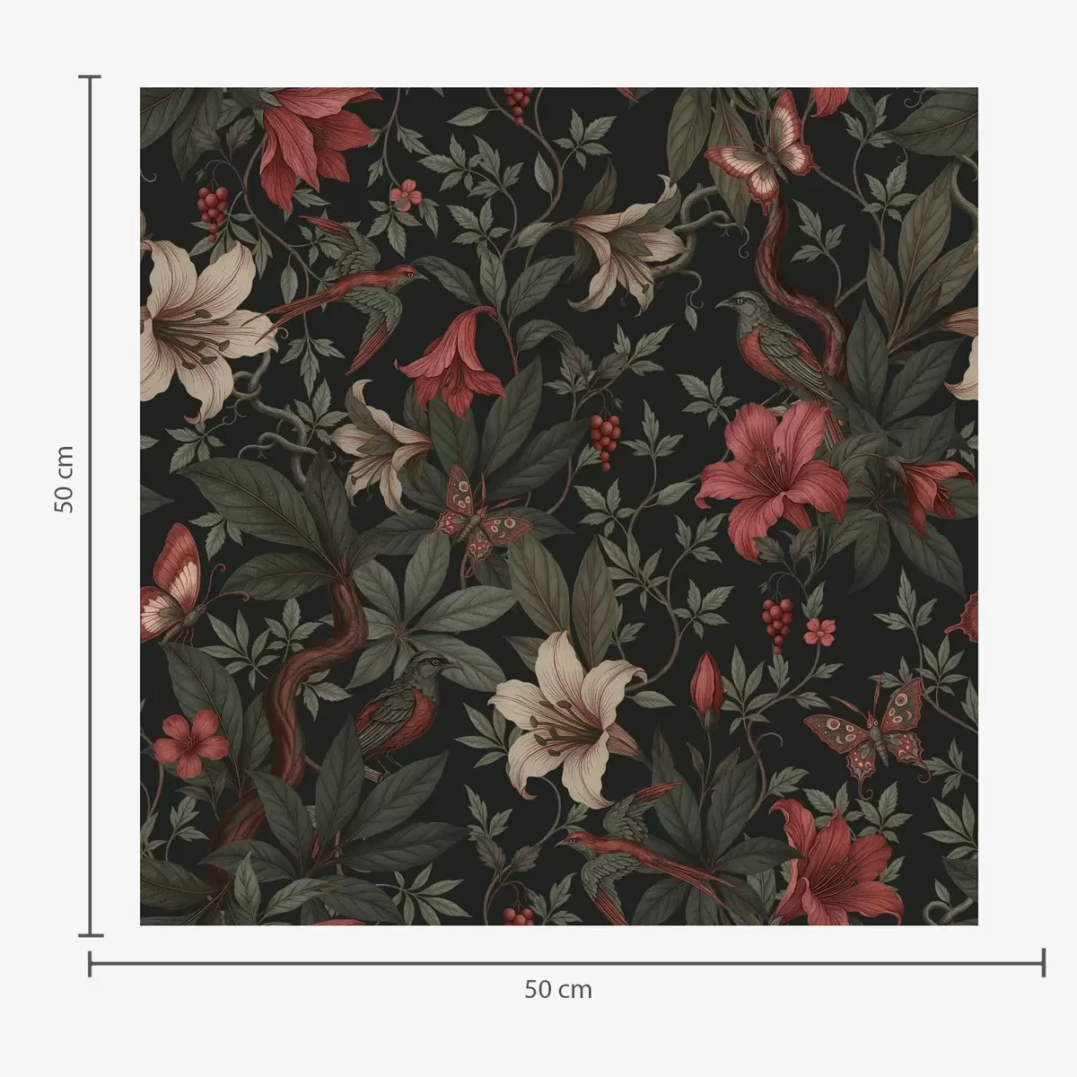 Tapetai Tamsūs džiunglių gėlių motyvai su paukščiais ir drugeliais Nr. a00895