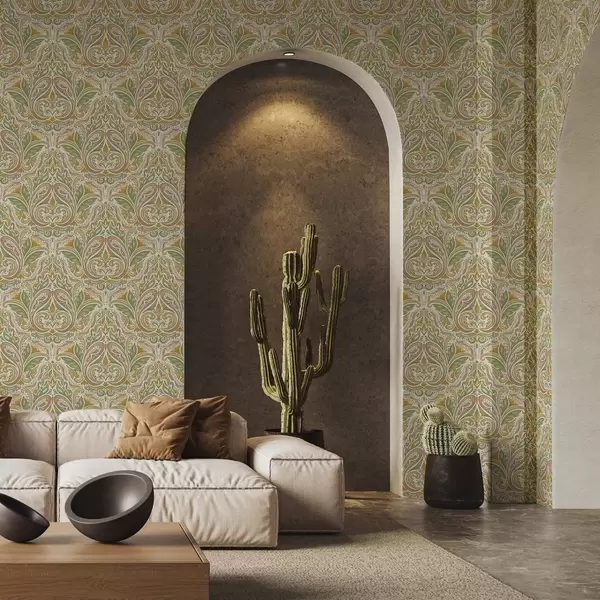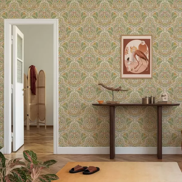 Tapetai Dekoratyviniai lapų sūkuriai žalios ir terakotos spalvų tonais Nr. a00927v1