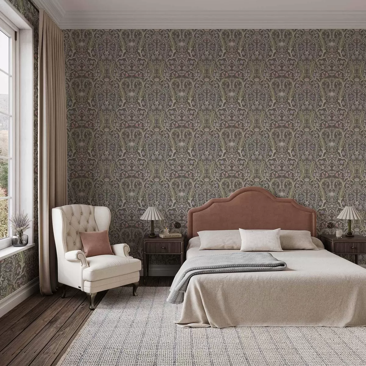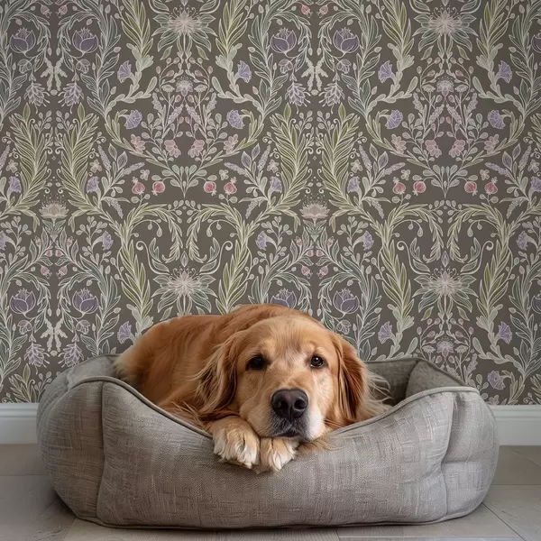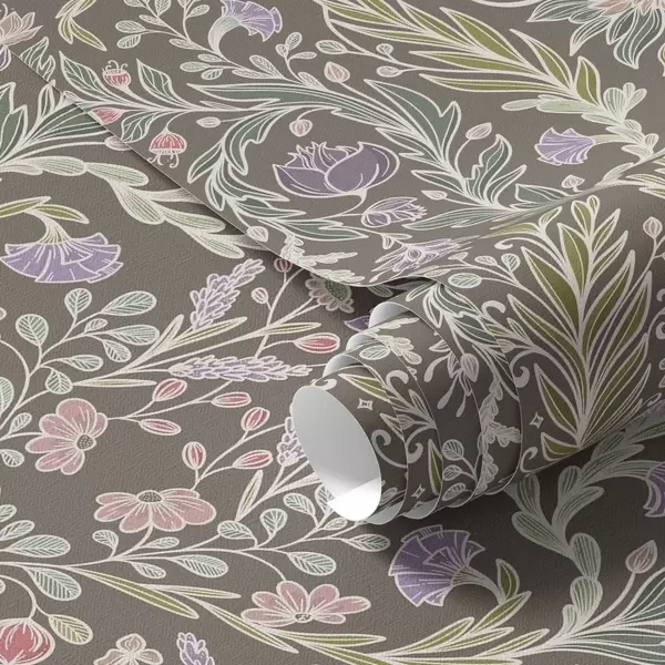 Tapetai Simetriški žiedai ir lapai rusvai pilkame fone Nr. a00928v2