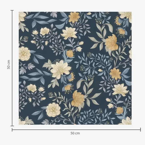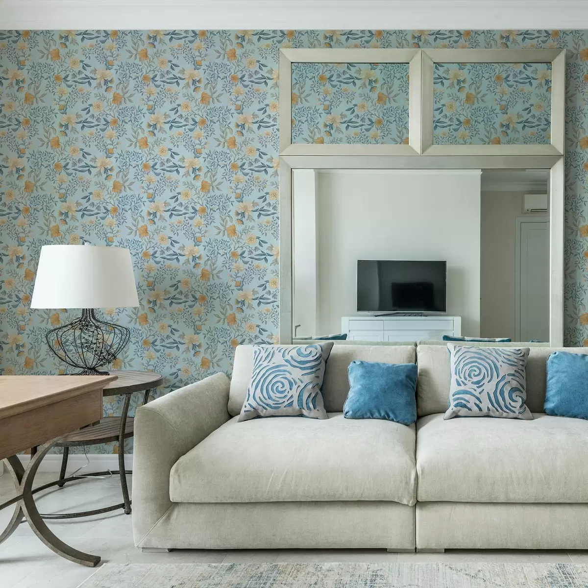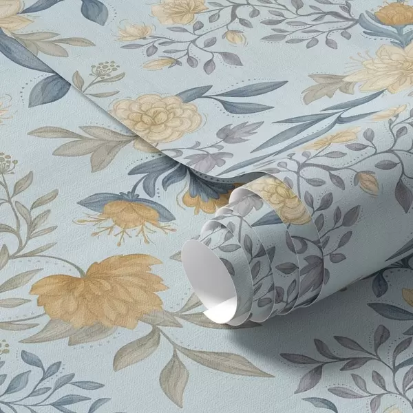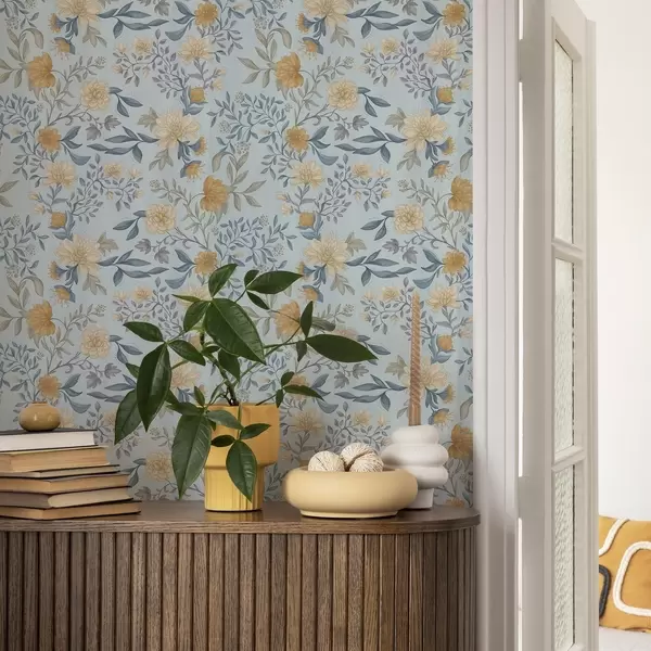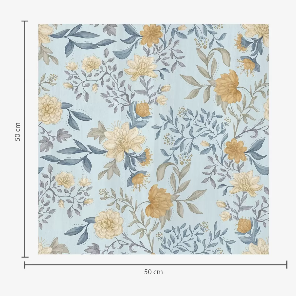 Tapetai Geltonos ir mėlynos gėlės su lapais ant dangaus mėlynumo fono Nr. a00934