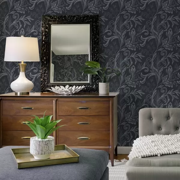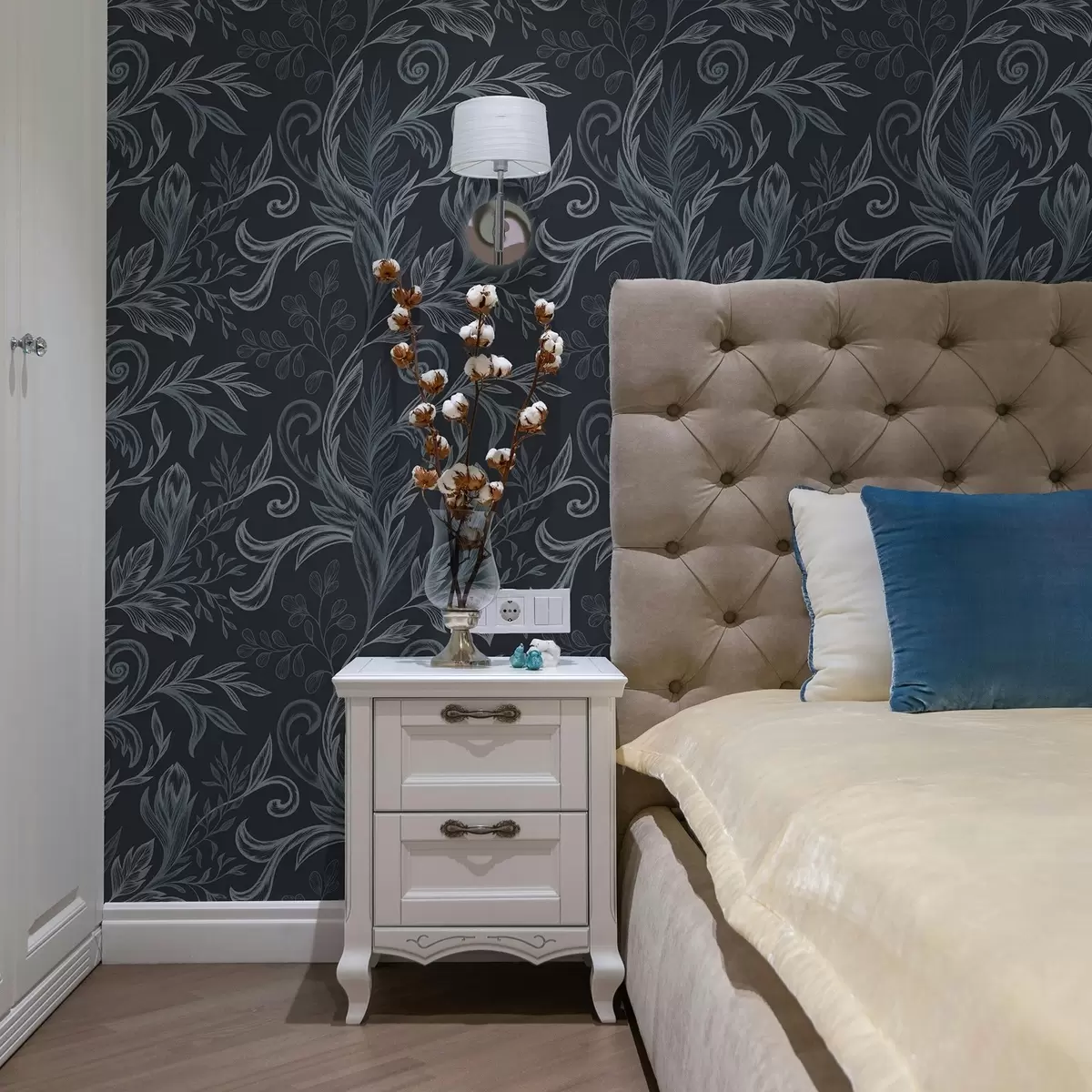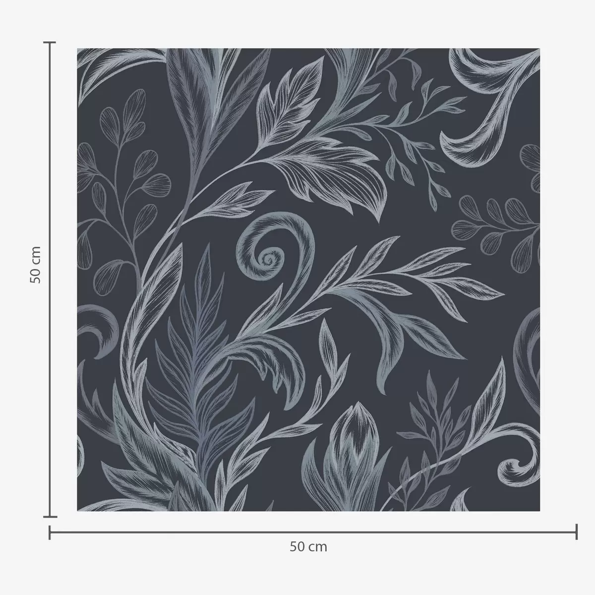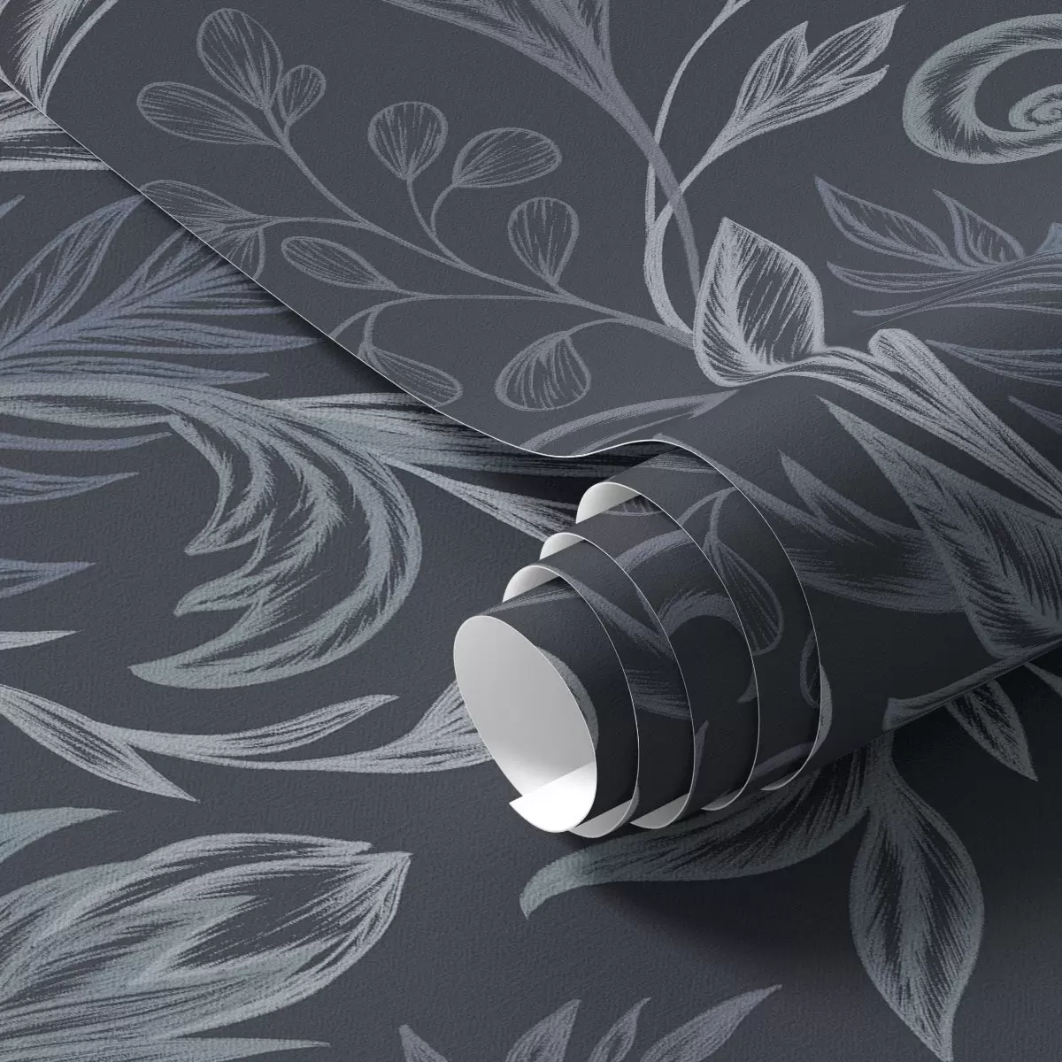 Tapetai Tamsiai indigo spalvos susirangę lapai su ranka nupieštu šešėliavimu Nr. a00935