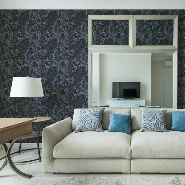 Tapetai Tamsiai indigo spalvos susirangę lapai su ranka nupieštu šešėliavimu Nr. a00935