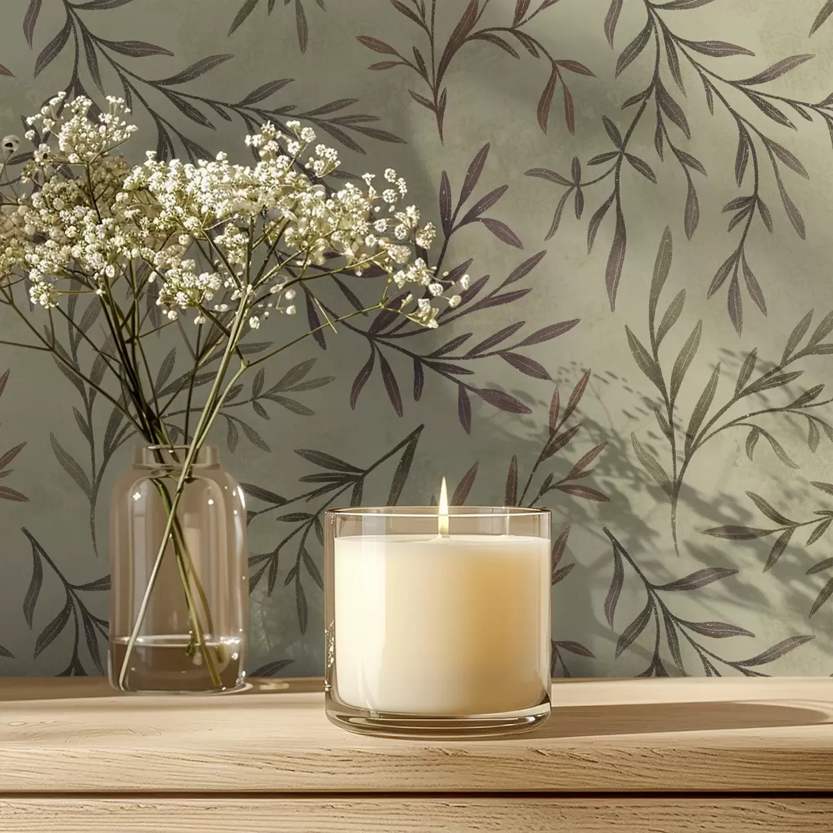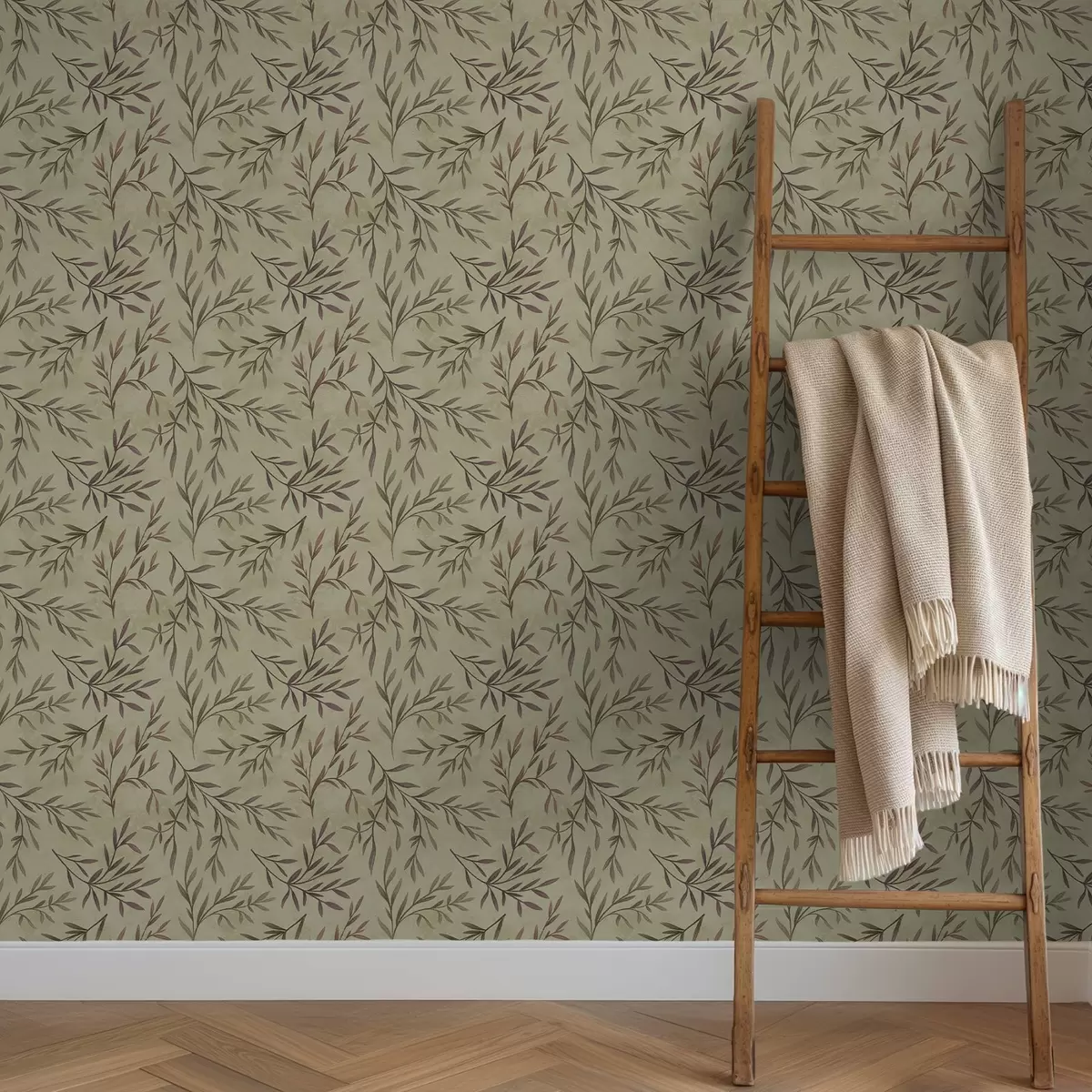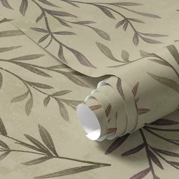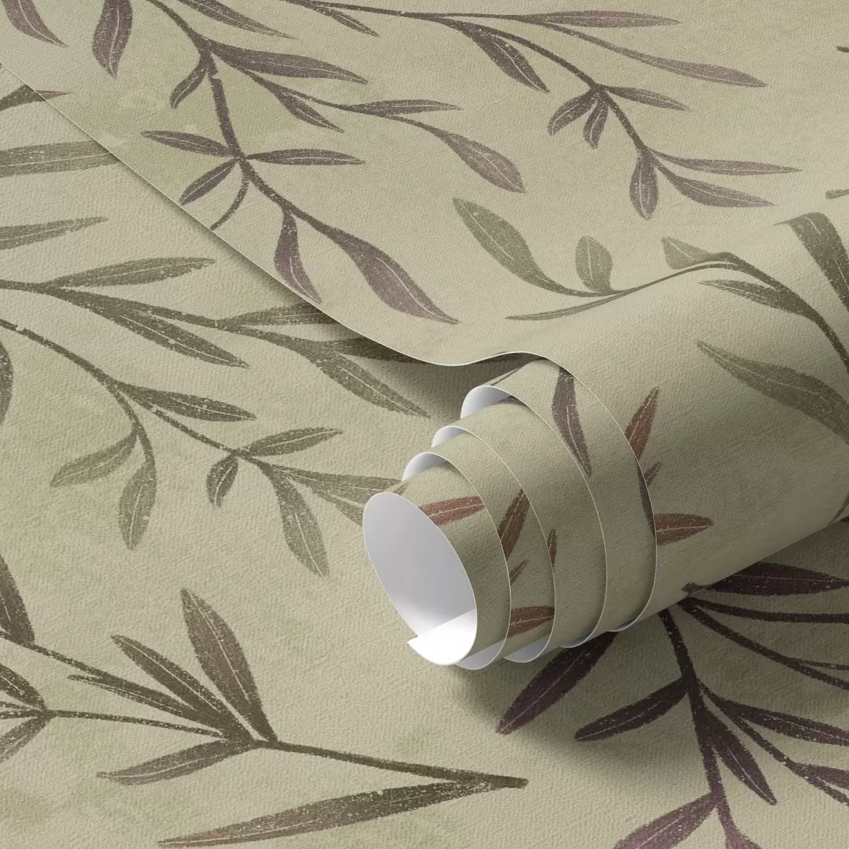 Tapetai Alyvinės ir žalios šakos su lapais ant šilto fono Nr. a00936v4