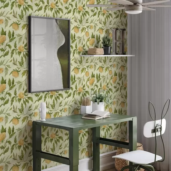 Tapetai Geltonos bijūnės ir lapai ant švelnaus šviesiai žalios spalvos fono Nr. a00942