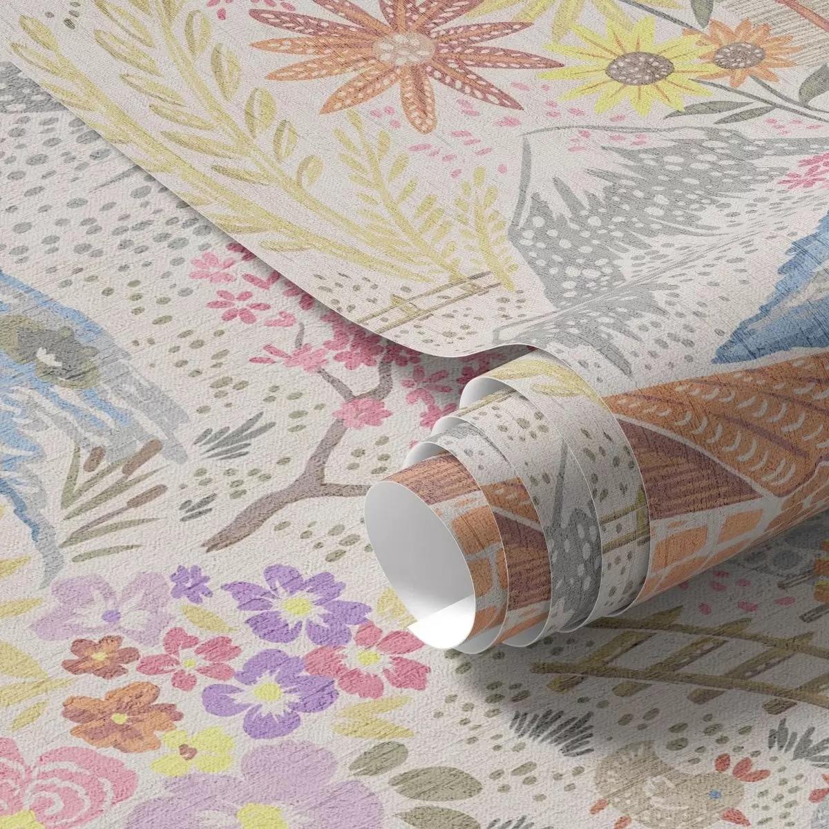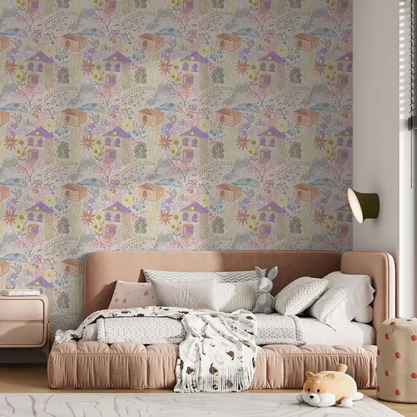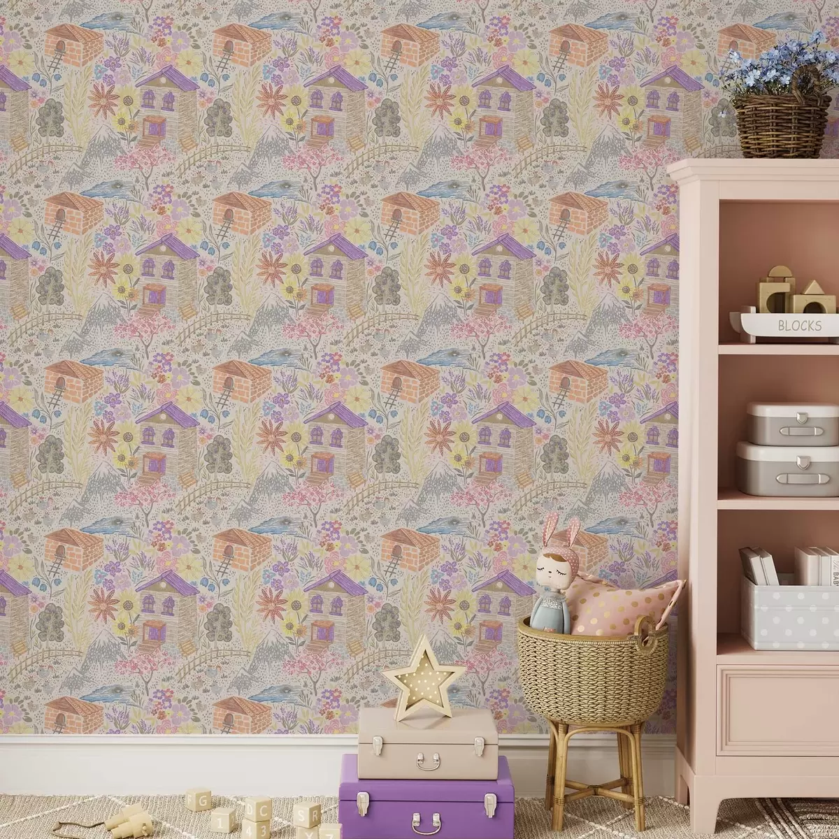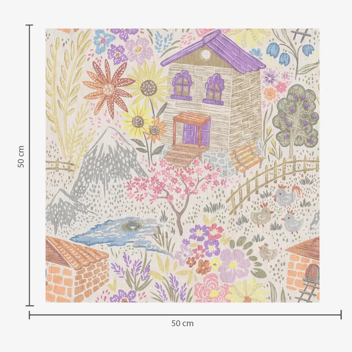 Tapetai Vaikiškas kaimo piešinys su namu, kalnais ir gėlėmis Nr. a00952