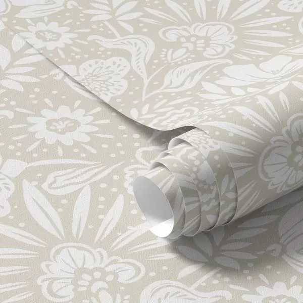 Tapetai Balta linijinė gėlių ornamentika ant smėlio spalvos fono Nr. a00956
