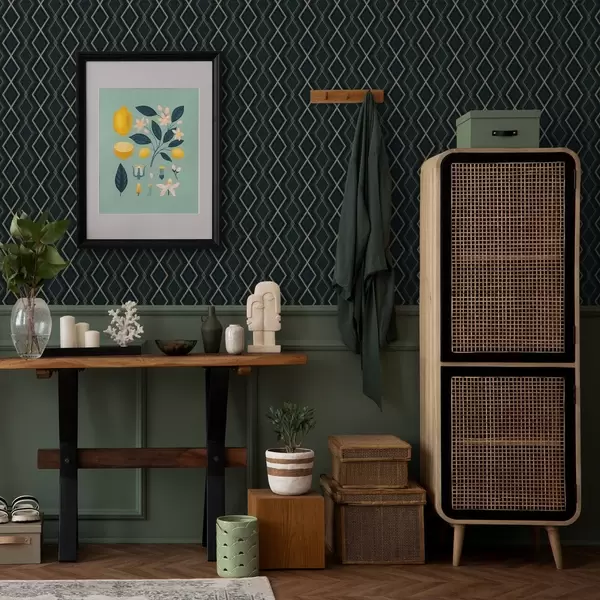 Tapetai Tamsiai žalios spalvos fonas su pasikartojančiu rombo formos tinkleliu Nr. a00975v1