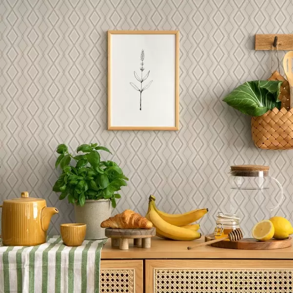 Tapetai Šviesiai smėlio spalvos fonas su daugiasluoksniu rombo formos tinkleliu Nr. a00975v2