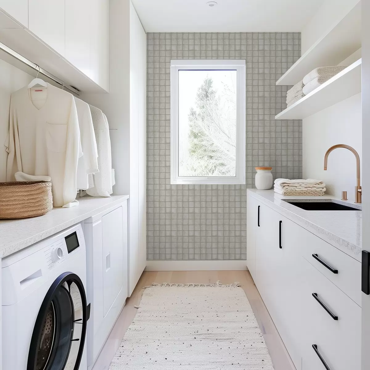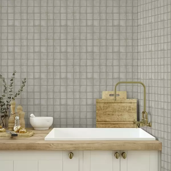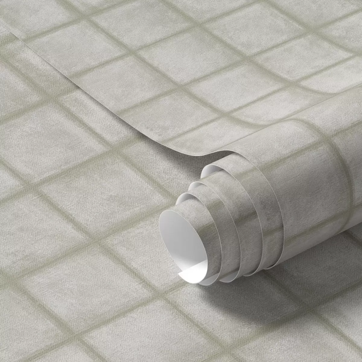 Tapetai Kvadratinių plytelių imitacija švelnios pilkai žalios spalvos paletėje Nr. a00988