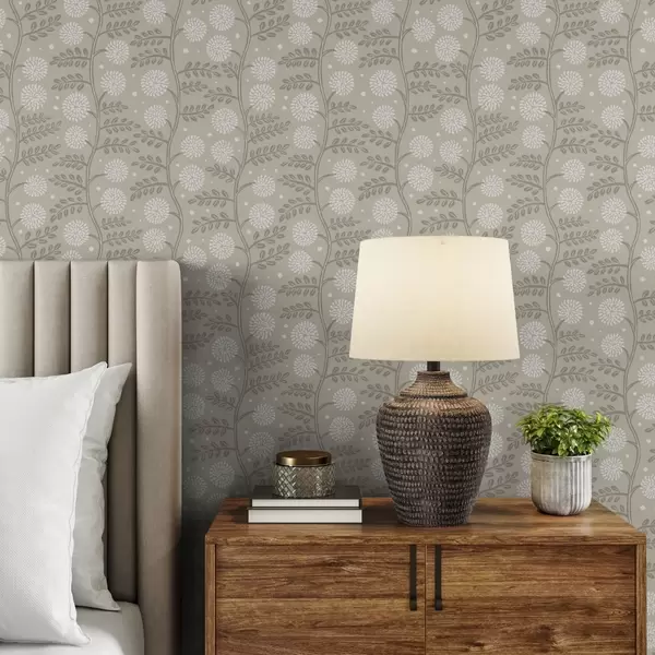 Tapetai Bėžinės spalvos stiebai su baltomis pūkuotomis gėlėmis ir švelniais taškeliais Nr. a00997