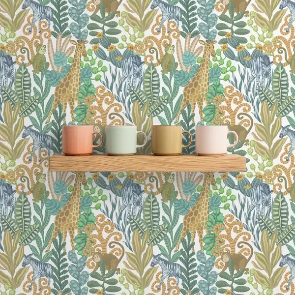 Tapetai Linksmi savanos gyvūnai tarp lapų ant balto fono Nr. a01000